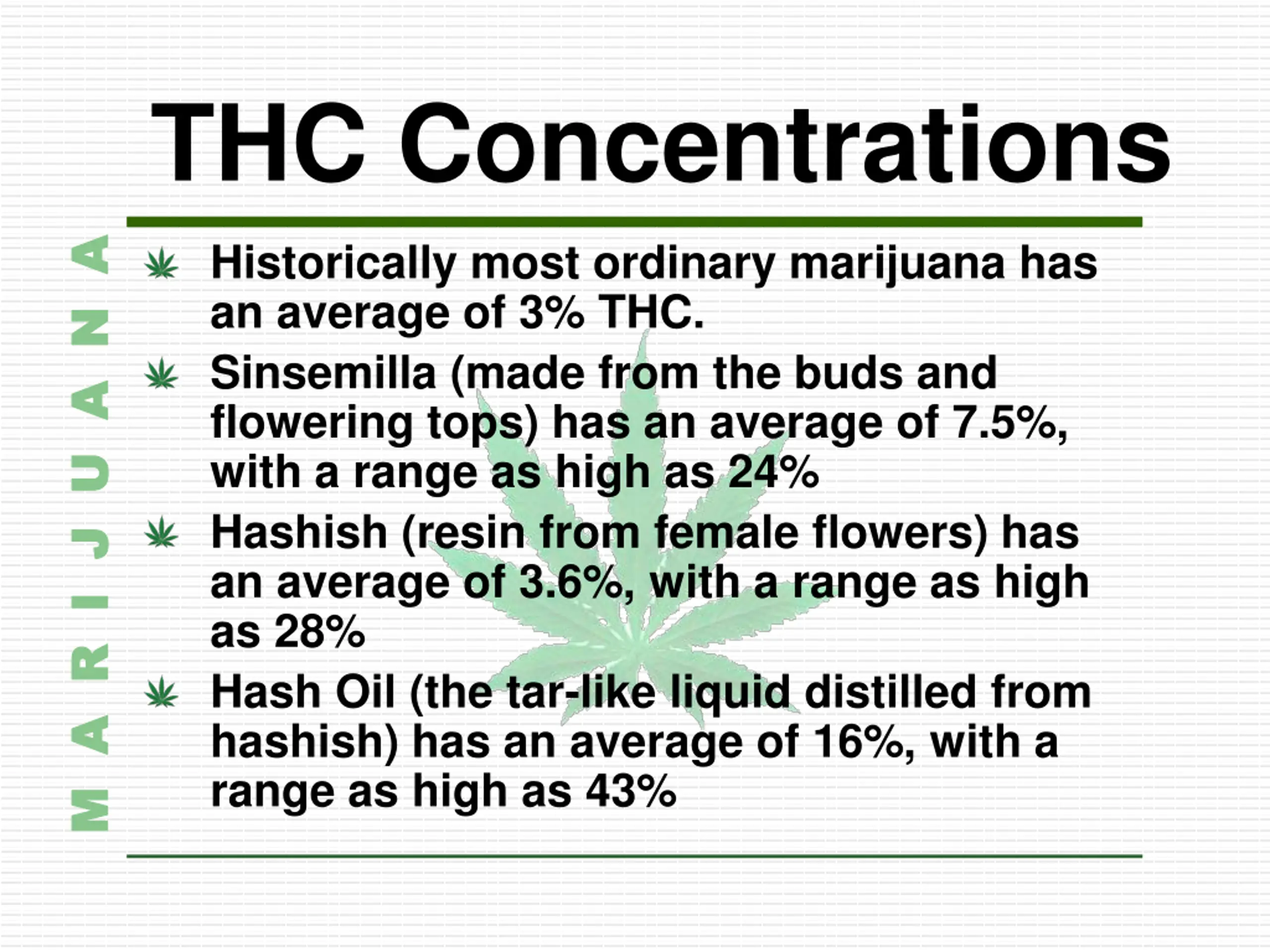 THC Concentrations Historically most ordinary marijuana has an average of 3% THC. Sinsemilla (made from the buds and flowering tops) has an average of 7.5%, with a range as high as 24% Hashish (resin from female flowers) has an average of 3.6%, with a range as high as 28% Hash Oil (the tar-like liquid distilled from hashish) has an average of 16%, with a range as high as 43% M A R I J U A N A M A R I J U A N A