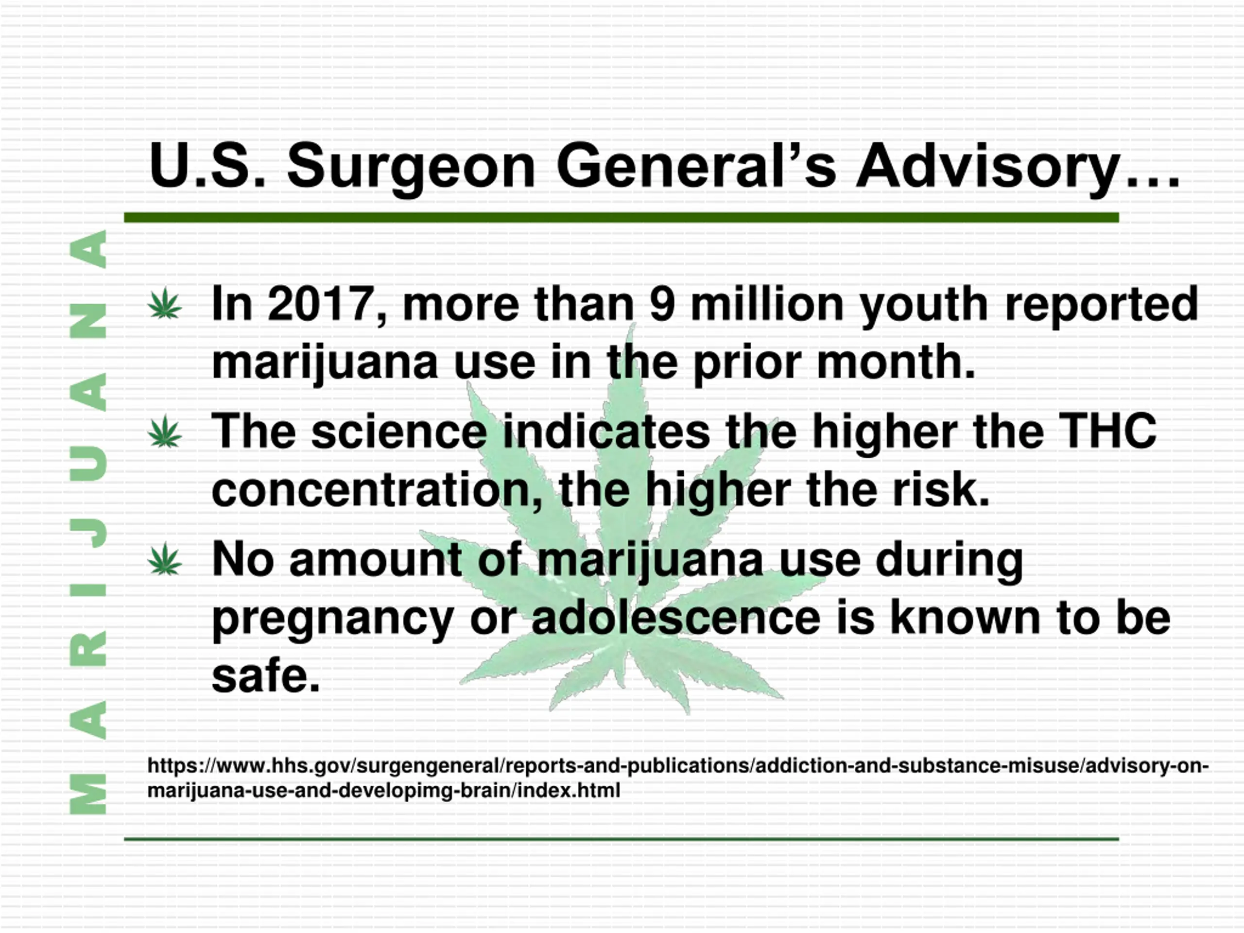 U.S. Surgeon Generals Advisory M A R I J U A N A M A R I J U A N A In 2017, more than 9 million youth reported marijuana use in the prior month. The science indicates the higher the THC concentration, the higher the risk. No amount of marijuana use during pregnancy or adolescence is known to be safe. https://www.hhs.gov/surgengeneral/reports-and-publications/addiction-and-substance-misuse/advisory-on- marijuana-use-and-developimg-brain/index.html