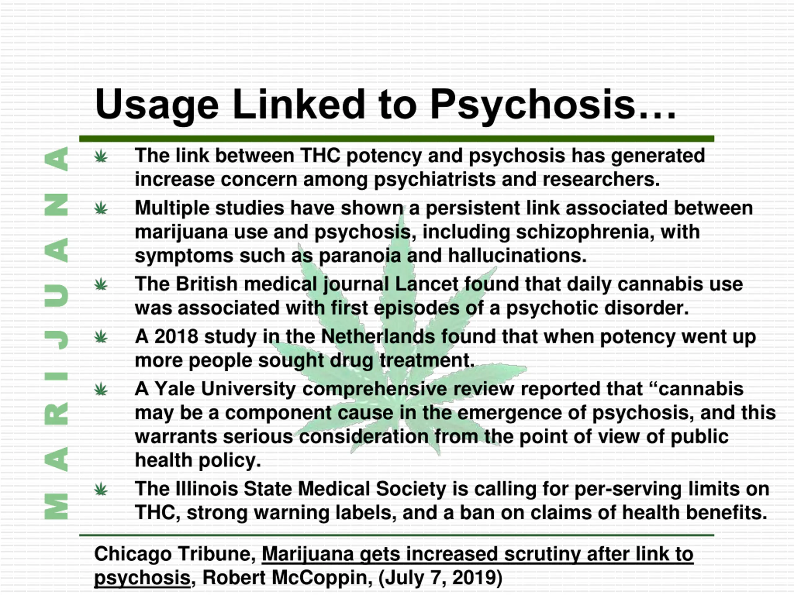 Usage Linked to Psychosis The link between THC potency and psychosis has generated increase concern among psychiatrists and researchers. Multiple studies have shown a persistent link associated between marijuana use and psychosis, including schizophrenia, with symptoms such as paranoia and hallucinations. The British medical journal Lancet found that daily cannabis use was associated with first episodes of a psychotic disorder. A 2018 study in the Netherlands found that when potency went up more people sought drug treatment. A Yale University comprehensive review reported that cannabis may be a component cause in the emergence of psychosis, and this warrants serious consideration from the point of view of public health policy. The Illinois State Medical Society is calling for per-serving limits on THC, strong warning labels, and a ban on claims of health benefits. M A R I J U A N A M A R I J U A N A Chicago Tribune, Marijuana gets increased scrutiny after link to psychosis, Robert McCoppin, (July 7, 2019)