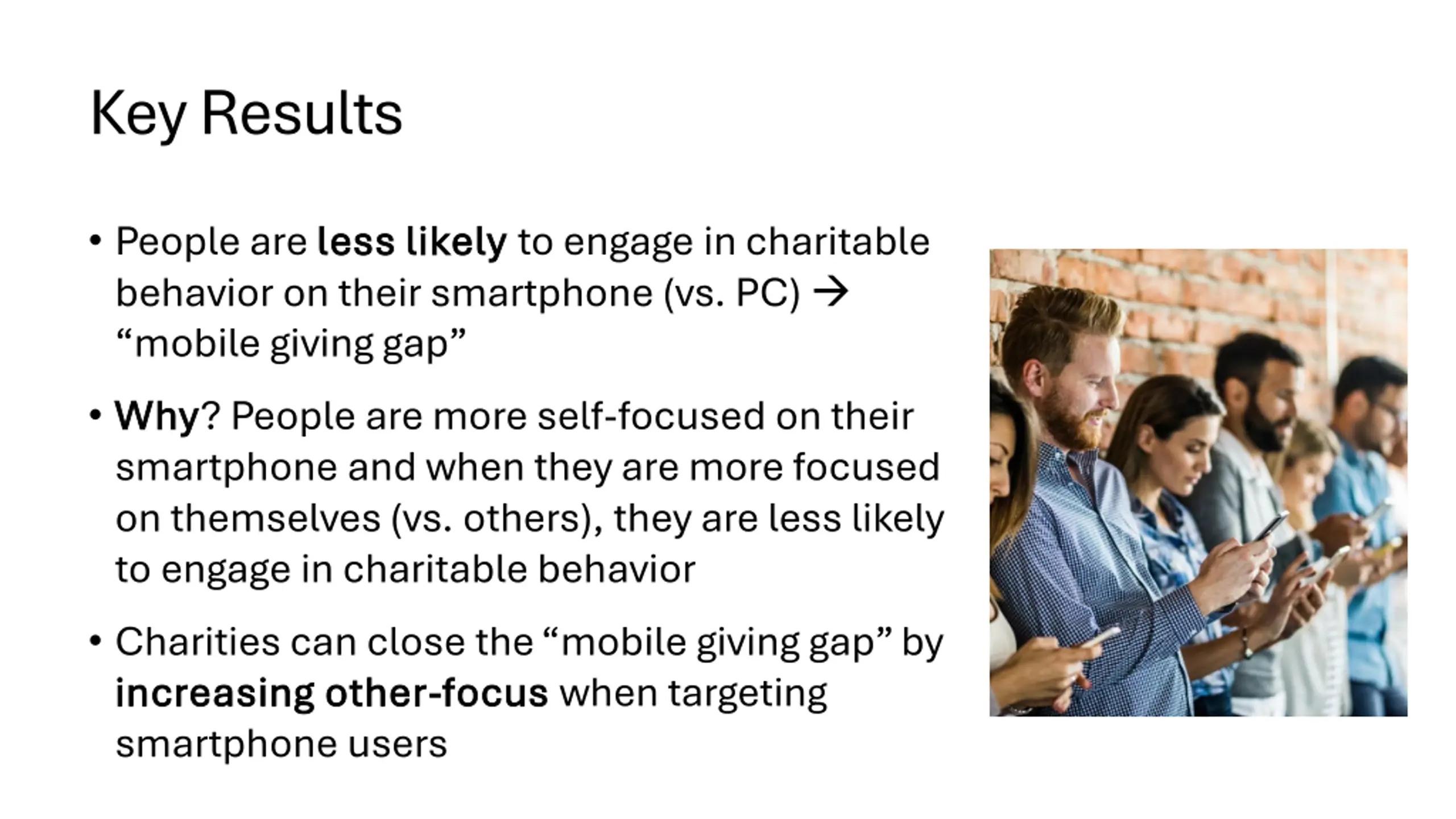Key Results People are less likely behavior on their smartphone (vs. PC) mobile giving gap Why Why? People are more self-focused on their smartphone and when they are more focused on themselves (vs. others), they are less likely to engage in charitable behavior Charities can close the mobile giving gap by increasing other increasing other- -focus focus when targeting smartphone users less likely to engage in charitable