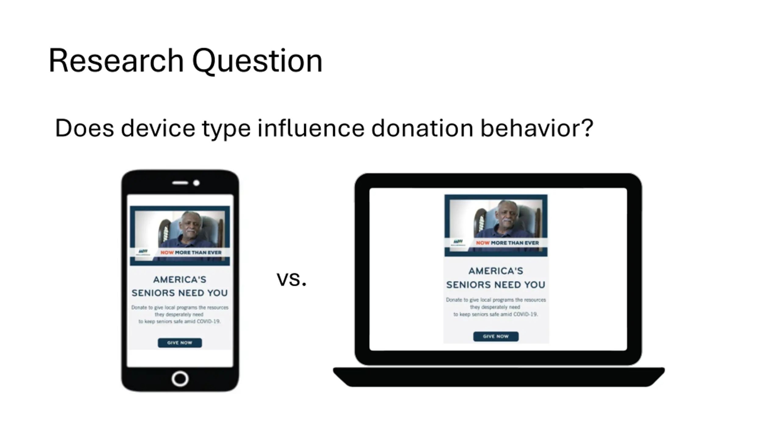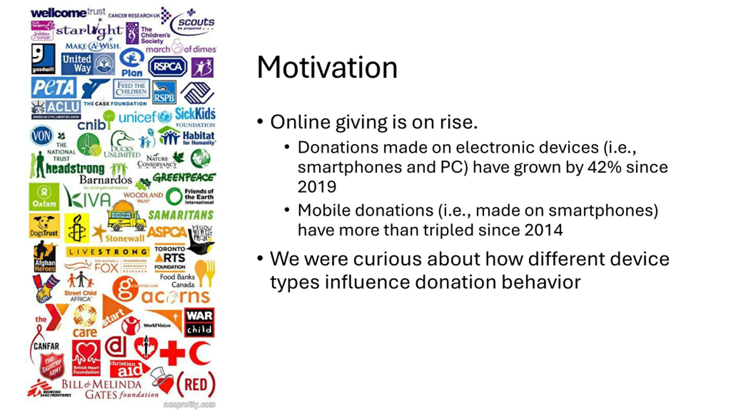 Motivation Online giving is on rise. Donations made on electronic devices (i.e., smartphones and PC) have grown by 42% since 2019 Mobile donations (i.e., made on smartphones) have more than tripled since 2014 We were curious about how different device types influence donation behavior