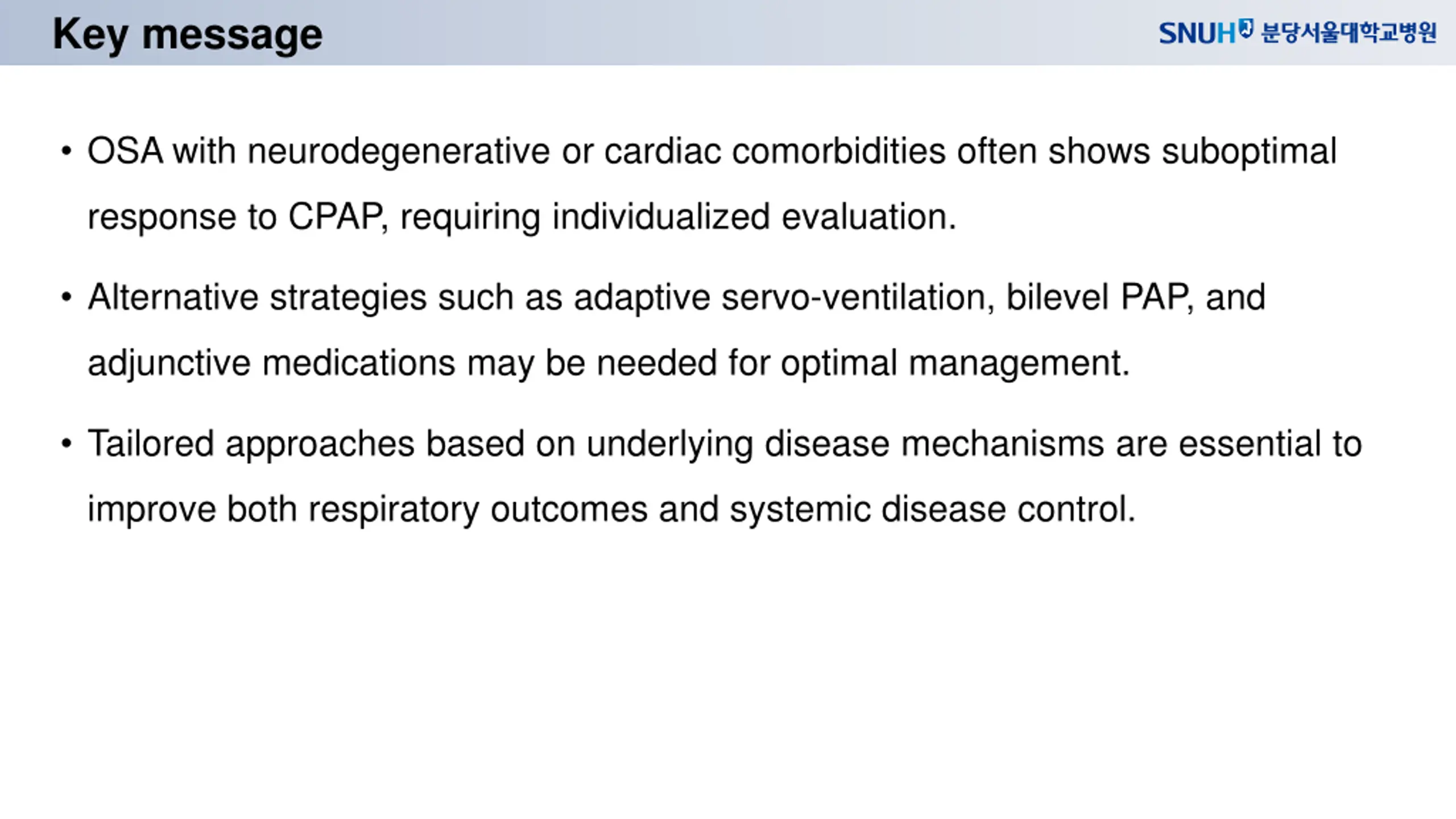 Key message OSA with neurodegenerative or cardiac comorbidities often shows suboptimal response to CPAP, requiring individualized evaluation. Alternative strategies such as adaptive servo-ventilation, bilevel PAP, and adjunctive medications may be needed for optimal management. Tailored approaches based on underlying disease mechanisms are essential to improve both respiratory outcomes and systemic disease control.
