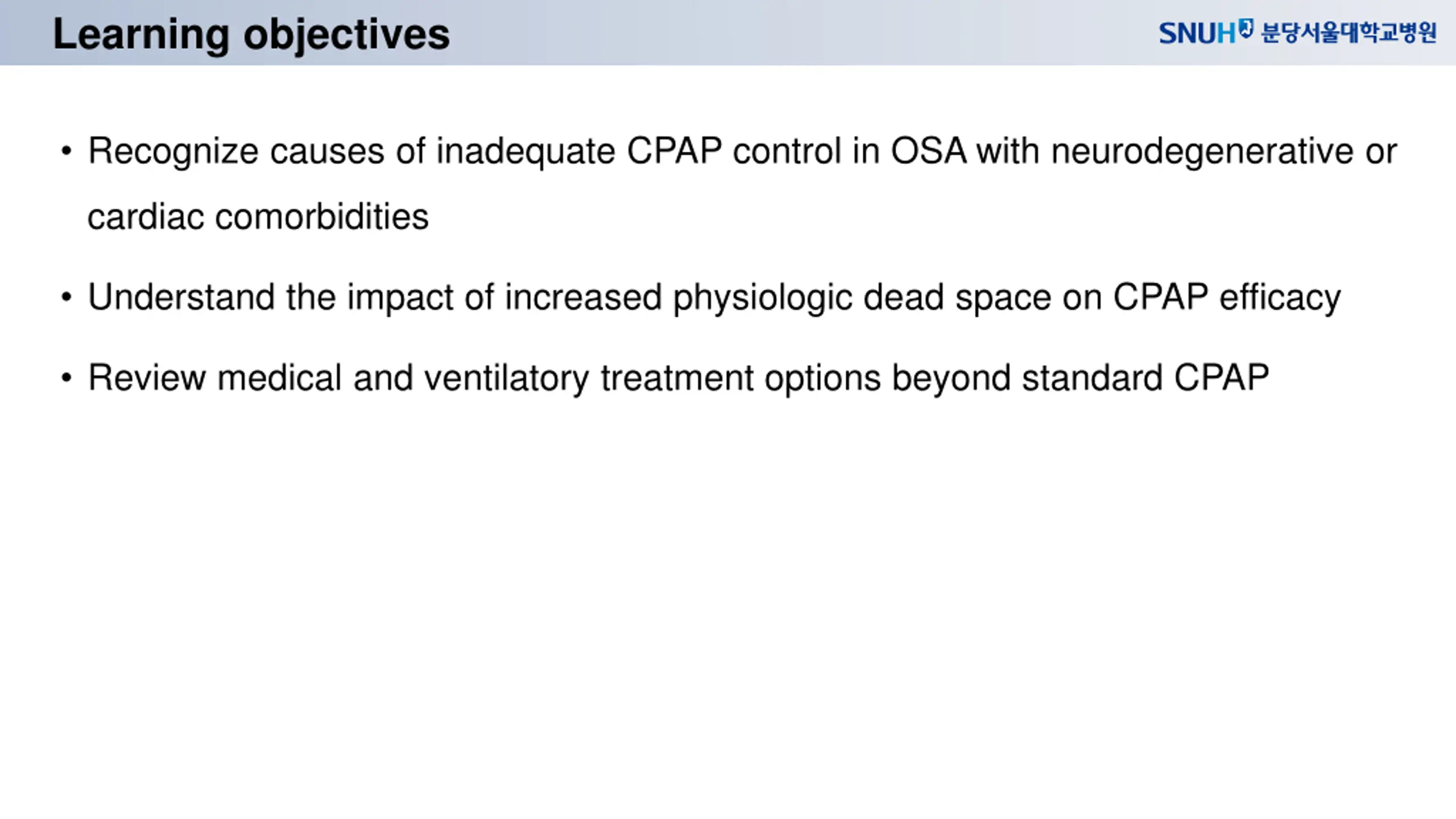 Learning objectives Recognize causes of inadequate CPAP control in OSA with neurodegenerative or cardiac comorbidities Understand the impact of increased physiologic dead space on CPAP efficacy Review medical and ventilatory treatment options beyond standard CPAP