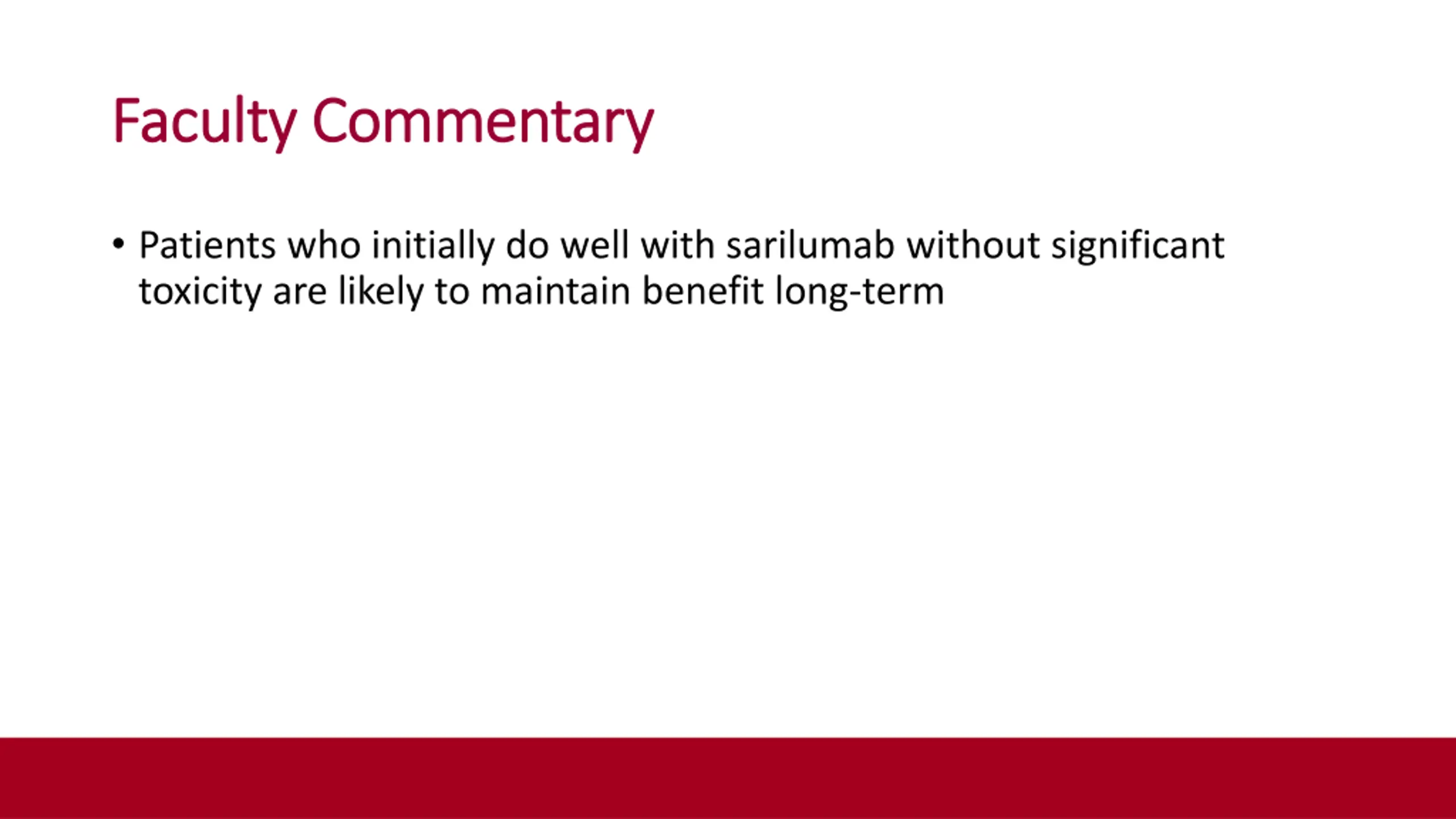 Faculty Commentary Faculty Commentary Patients who initially do well with sarilumab without significant toxicity are likely to maintain benefit long-term