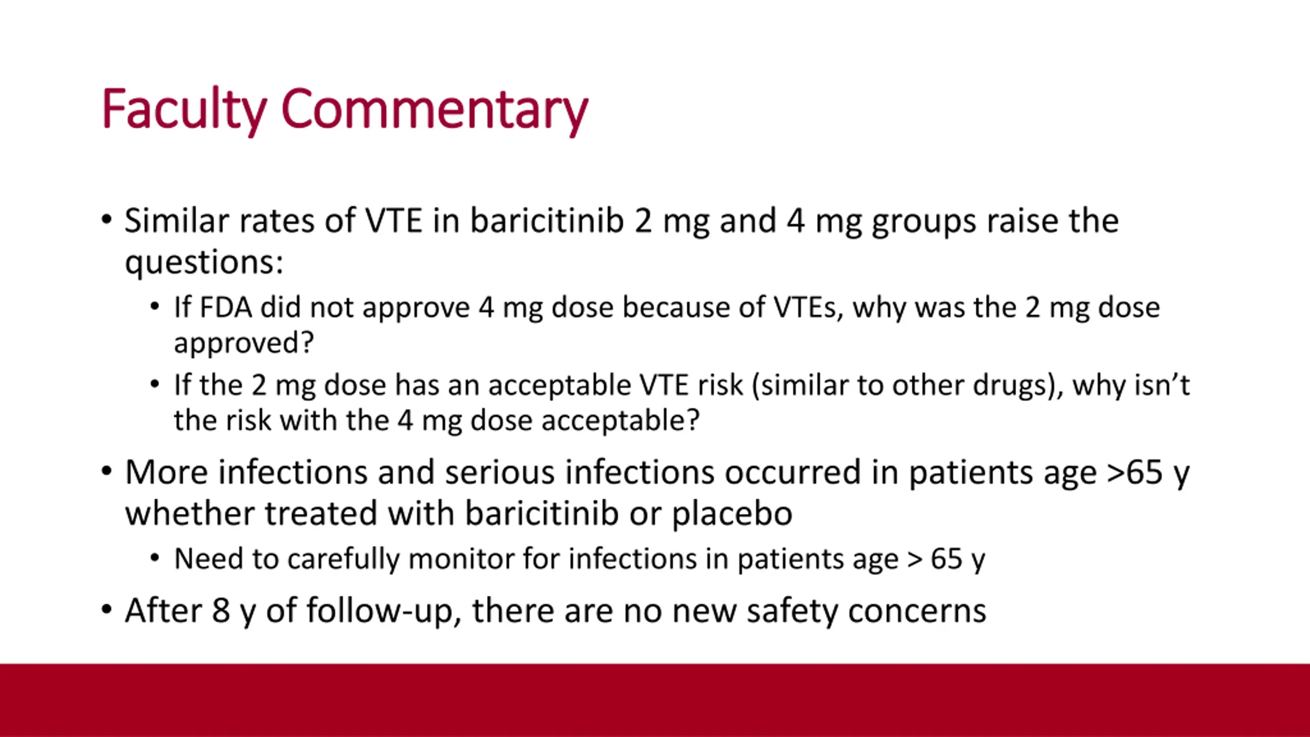 Faculty Commentary Faculty Commentary Similar rates of VTE in baricitinib 2 mg and 4 mg groups raise the questions: If FDA did not approve 4 mg dose because of VTEs, why was the 2 mg dose approved? If the 2 mg dose has an acceptable VTE risk (similar to other drugs), why isn t the risk with the 4 mg dose acceptable? More infections and serious infections occurred in patients age >65 y whether treated with baricitinib or placebo Need to carefully monitor for infections in patients age > 65 y After 8 y of follow-up, there are no new safety concerns