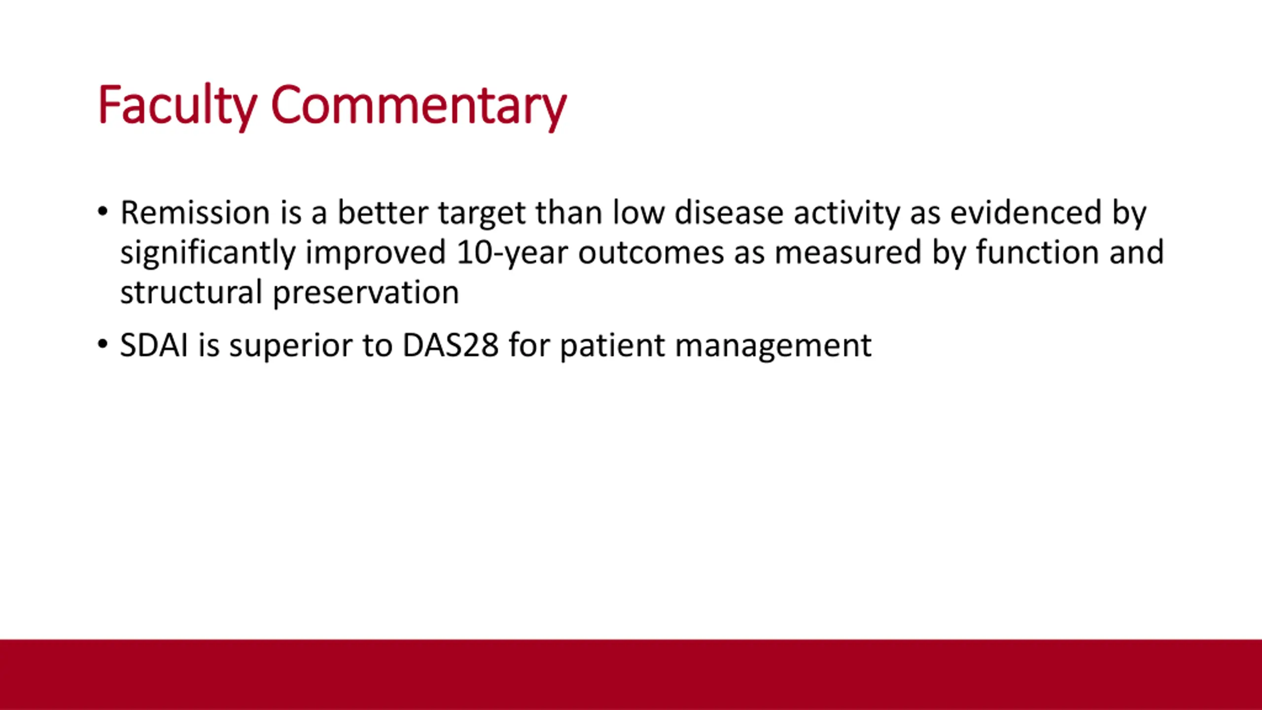 Faculty Commentary Faculty Commentary Remission is a better target than low disease activity as evidenced by significantly improved 10-year outcomes as measured by function and structural preservation SDAI is superior to DAS28 for patient management