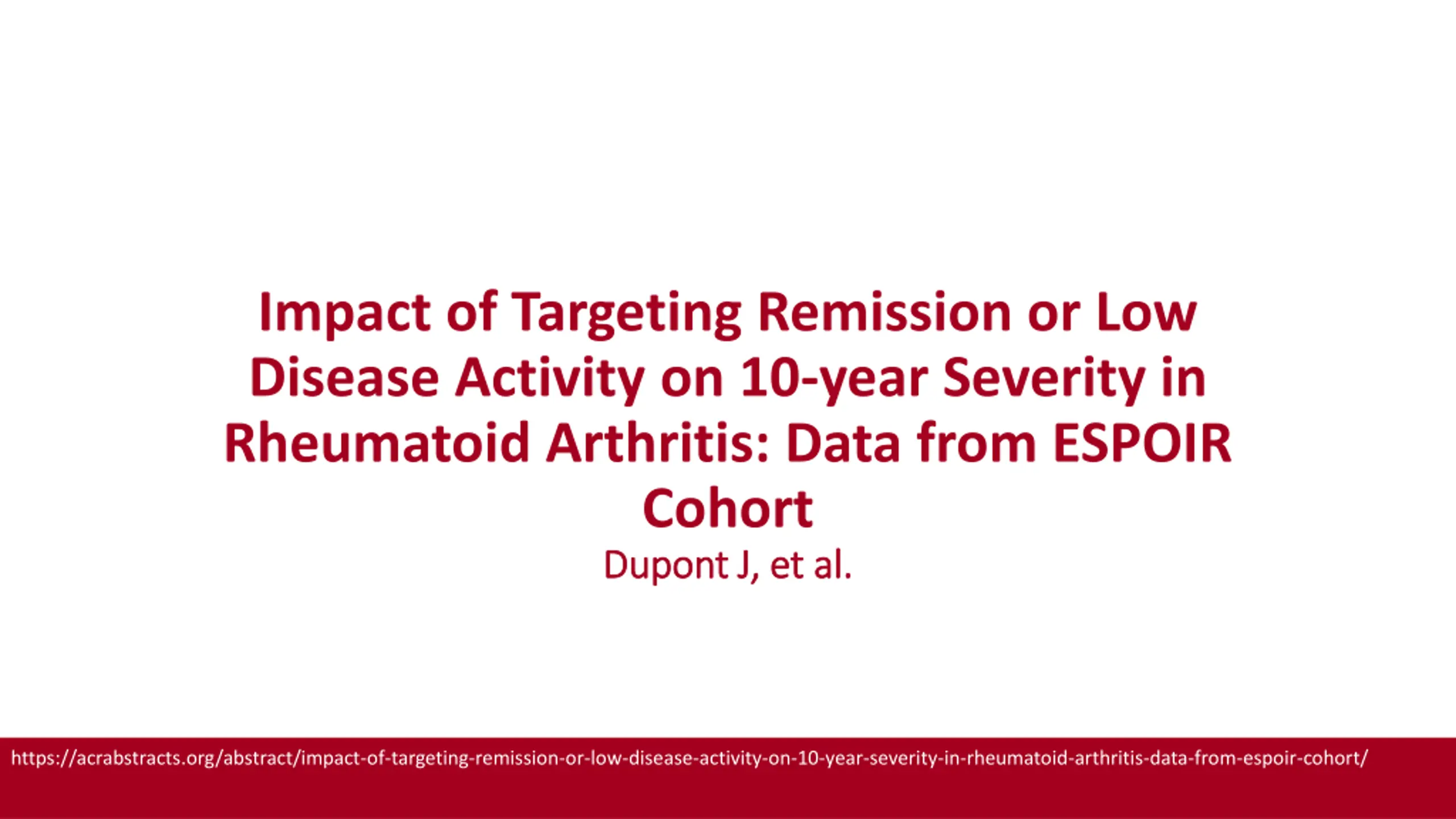 Impact of Targeting Remission or Low Disease Activity on 10-year Severity in Rheumatoid Arthritis: Data from ESPOIR Cohort Dupont J, et al. Dupont J, et al. https://acrabstracts.org/abstract/impact-of-targeting-remission-or-low-disease-activity-on-10-year-severity-in-rheumatoid-arthritis-data-from-espoir-cohort/