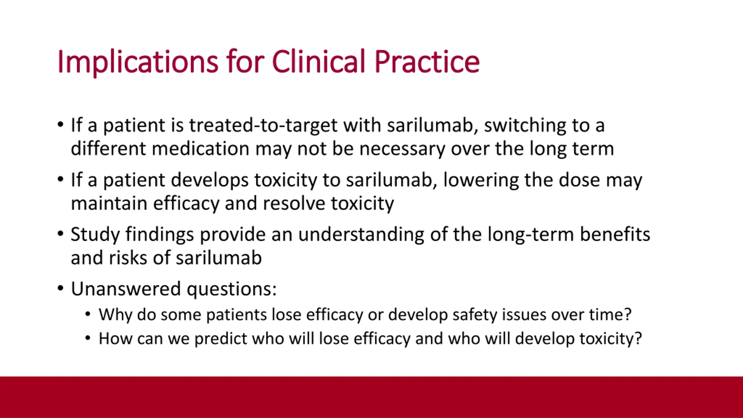 Implications for Clinical Practice Implications for Clinical Practice If a patient is treated-to-target with sarilumab, switching to a different medication may not be necessary over the long term If a patient develops toxicity to sarilumab, lowering the dose may maintain efficacy and resolve toxicity Study findings provide an understanding of the long-term benefits and risks of sarilumab Unanswered questions: Why do some patients lose efficacy or develop safety issues over time? How can we predict who will lose efficacy and who will develop toxicity?