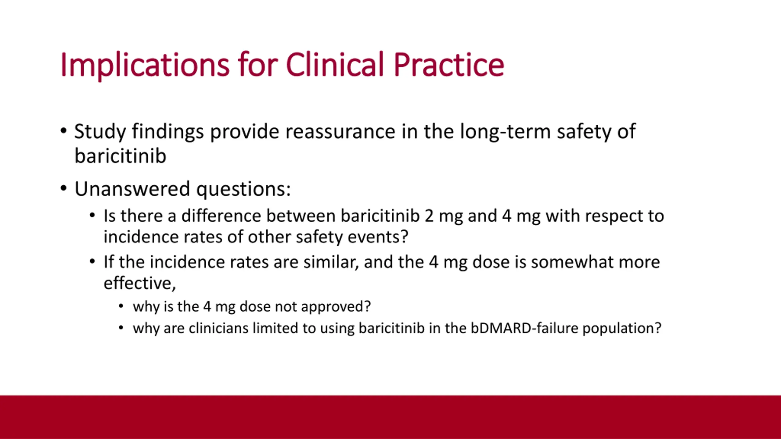 Implications for Clinical Practice Implications for Clinical Practice Study findings provide reassurance in the long-term safety of baricitinib Unanswered questions: Is there a difference between baricitinib 2 mg and 4 mg with respect to incidence rates of other safety events? If the incidence rates are similar, and the 4 mg dose is somewhat more effective, why is the 4 mg dose not approved? why are clinicians limited to using baricitinib in the bDMARD-failure population?