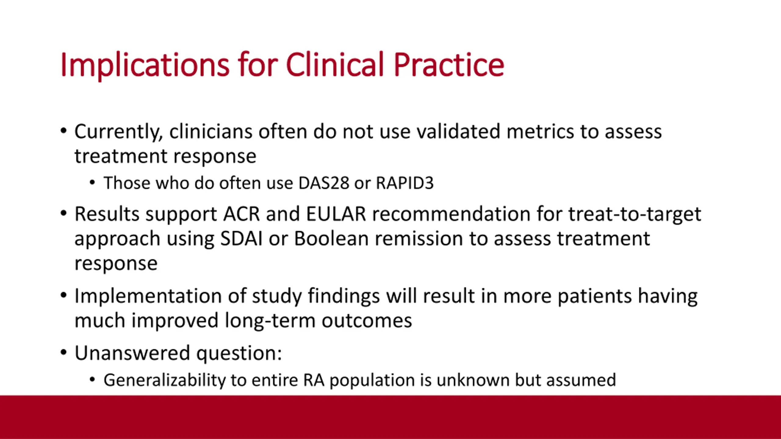 Implications for Clinical Practice Implications for Clinical Practice Currently, clinicians often do not use validated metrics to assess treatment response Those who do often use DAS28 or RAPID3 Results support ACR and EULAR recommendation for treat-to-target approach using SDAI or Boolean remission to assess treatment response Implementation of study findings will result in more patients having much improved long-term outcomes Unanswered question: Generalizability to entire RA population is unknown but assumed
