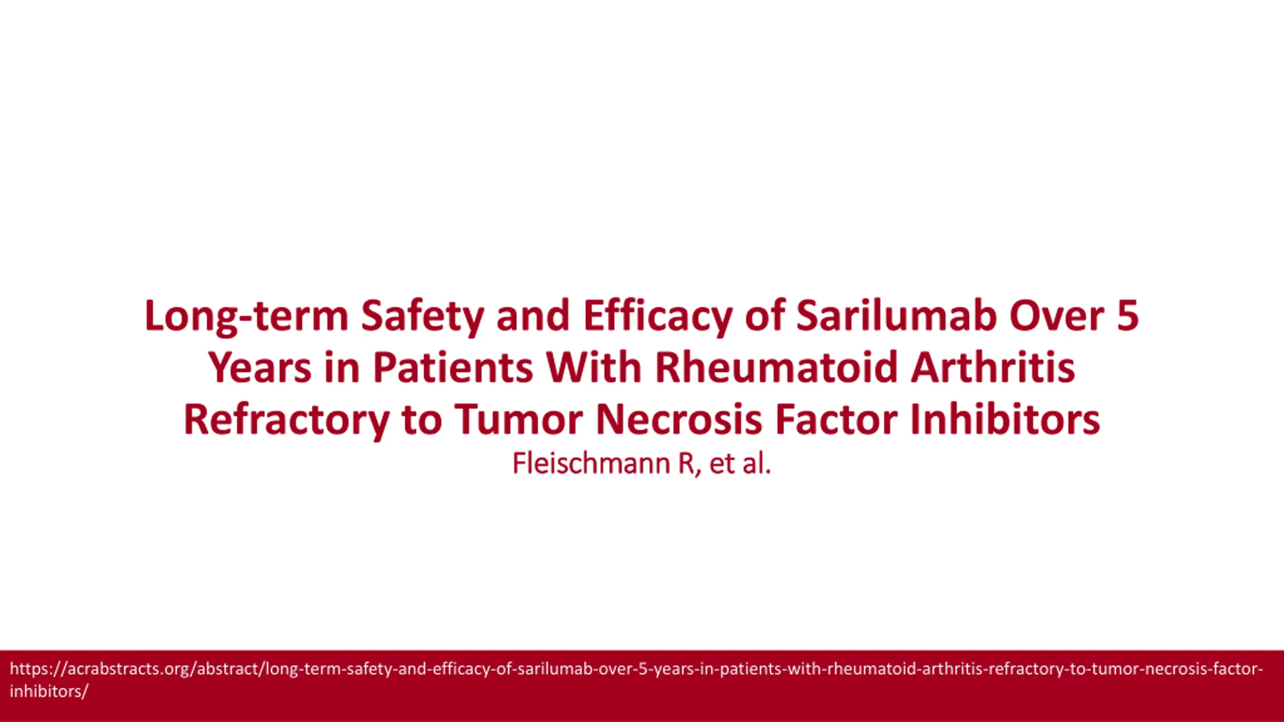 Long-term Safety and Efficacy of Sarilumab Over 5 Years in Patients With Rheumatoid Arthritis Refractory to Tumor Necrosis Factor Inhibitors Fleischmann R, et al. Fleischmann R, et al. https://acrabstracts.org/abstract/long-term-safety-and-efficacy-of-sarilumab-over-5-years-in-patients-with-rheumatoid-arthritis-refractory-to-tumor-necrosis-factor- inhibitors/