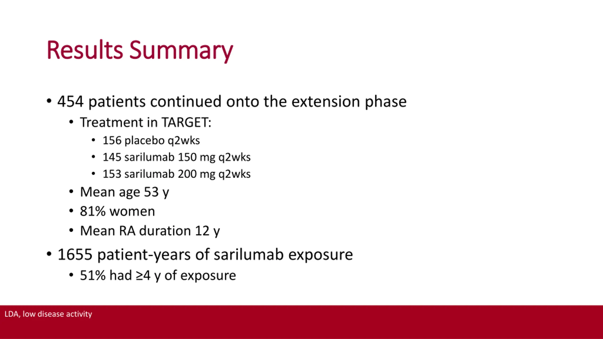 Results Summary Results Summary 454 patients continued onto the extension phase Treatment in TARGET: 156 placebo q2wks 145 sarilumab 150 mg q2wks 153 sarilumab 200 mg q2wks Mean age 53 y 81% women Mean RA duration 12 y 1655 patient-years of sarilumab exposure 51% had 4 y of exposure LDA, low disease activity