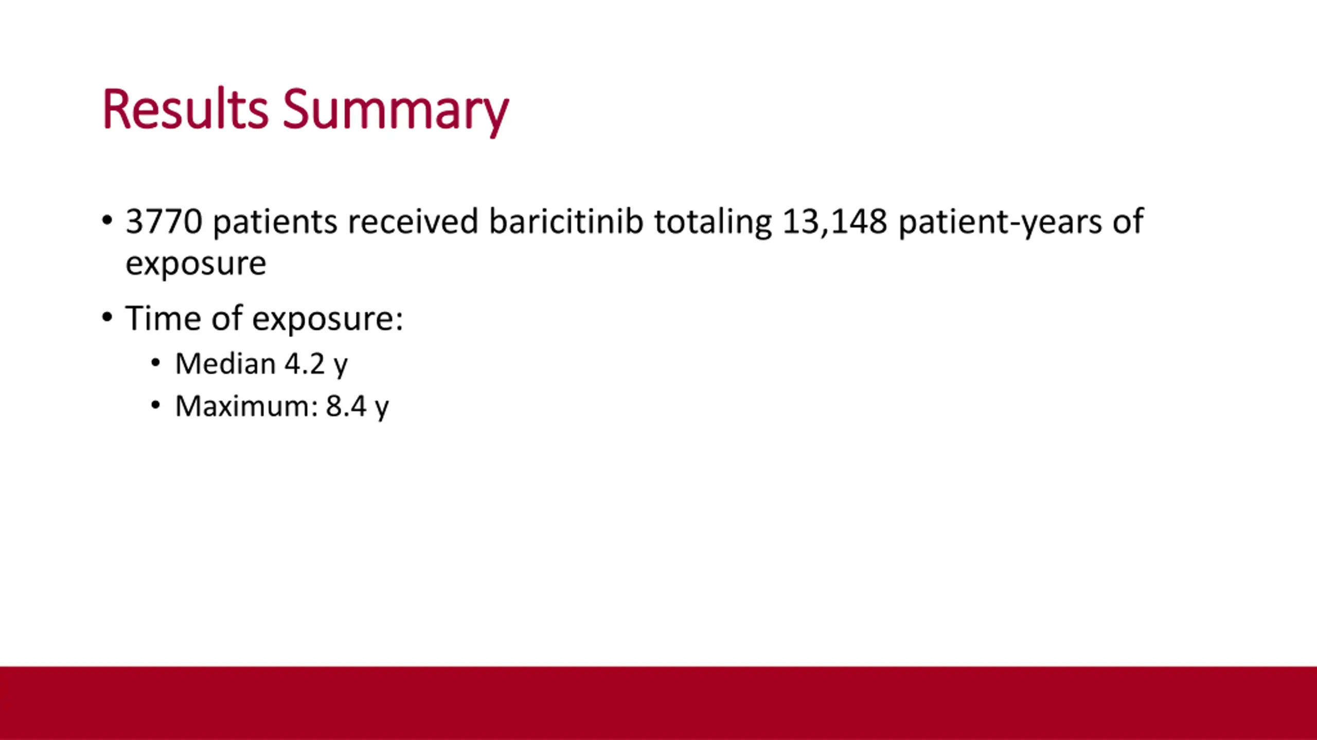 Results Summary Results Summary 3770 patients received baricitinib totaling 13,148 patient-years of exposure Time of exposure: Median 4.2 y Maximum: 8.4 y