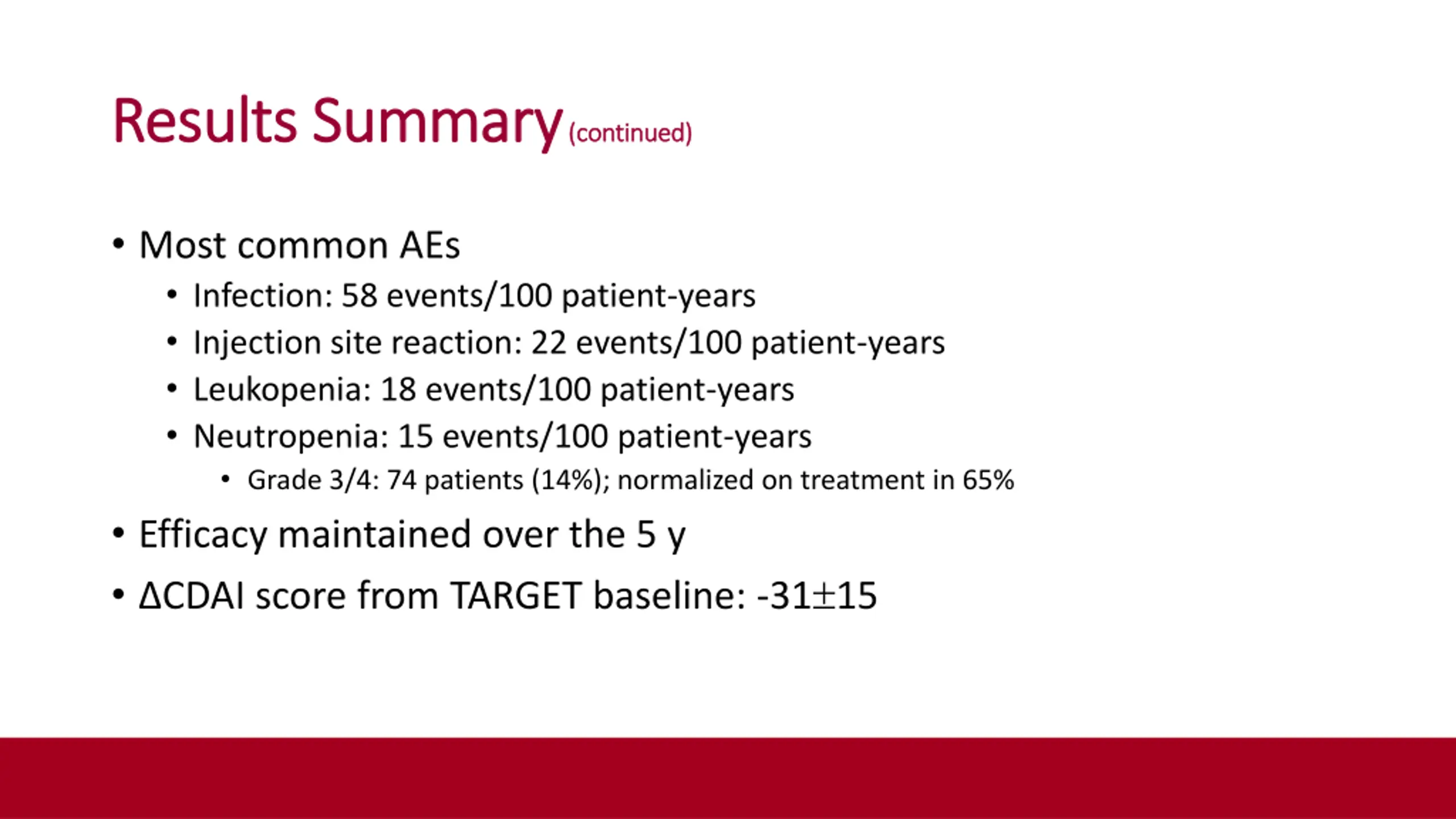 Results Summary Results Summary (continued) (continued) Most common AEs Infection: 58 events/100 patient-years Injection site reaction: 22 events/100 patient-years Leukopenia: 18 events/100 patient-years Neutropenia: 15 events/100 patient-years Grade 3/4: 74 patients (14%); normalized on treatment in 65% Efficacy maintained over the 5 y CDAI score from TARGET baseline: -31 15