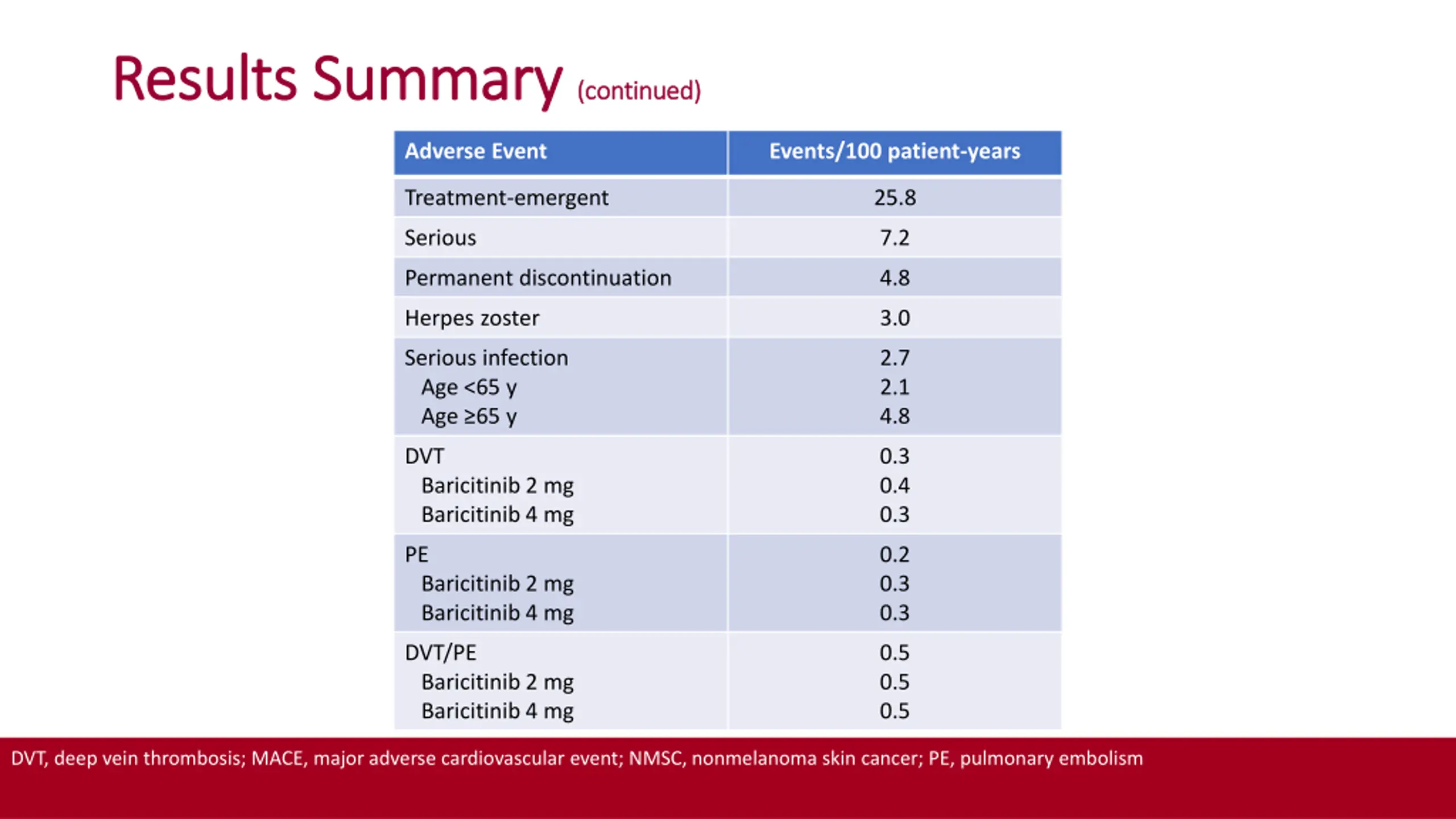 Results Summary Results Summary (continued) (continued) Adverse Event Events/100 patient-years Treatment-emergent 25.8 Serious 7.2 Permanent discontinuation 4.8 Herpes zoster 3.0 Serious infection Age <65 y Age 65 y 2.7 2.1 4.8 DVT Baricitinib 2 mg Baricitinib 4 mg 0.3 0.4 0.3 PE Baricitinib 2 mg Baricitinib 4 mg 0.2 0.3 0.3 DVT/PE Baricitinib 2 mg Baricitinib 4 mg 0.5 0.5 0.5 DVT, deep vein thrombosis; MACE, major adverse cardiovascular event; NMSC, nonmelanoma skin cancer; PE, pulmonary embolism