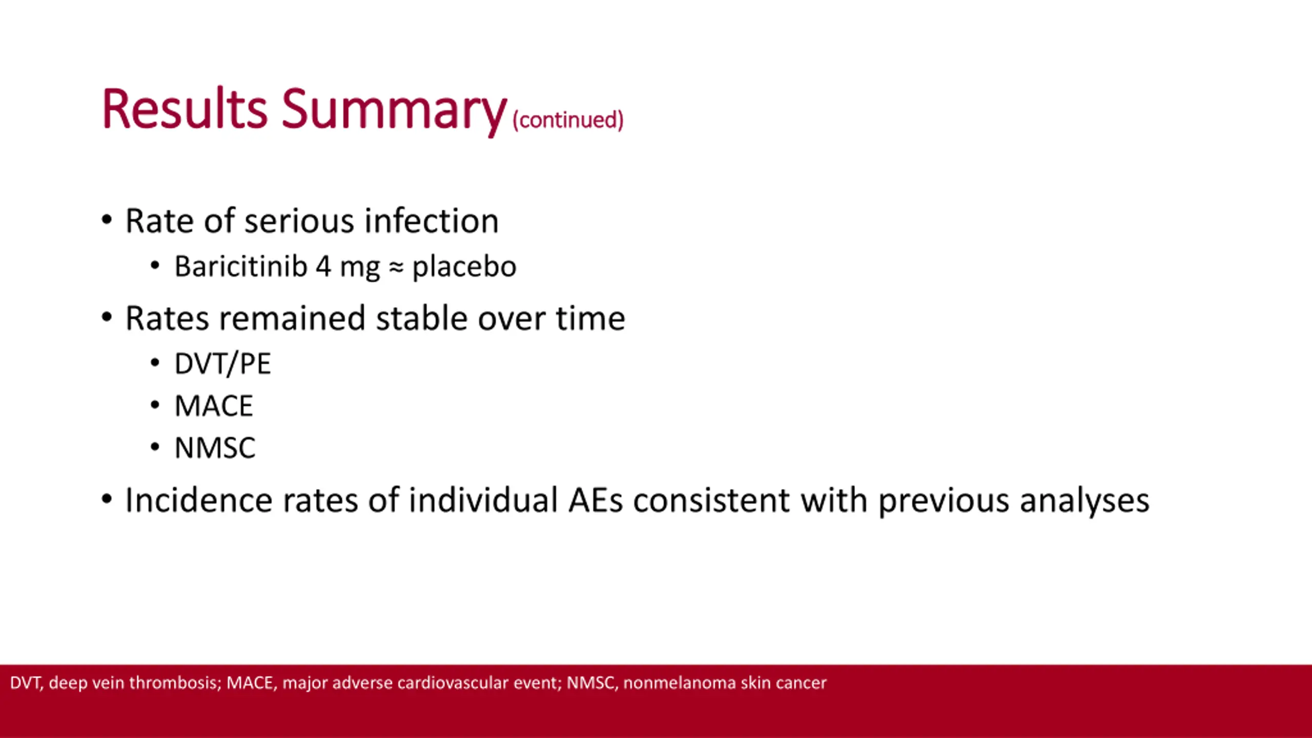 Results Summary Results Summary (continued) (continued) Rate of serious infection Baricitinib 4 mg placebo Rates remained stable over time DVT/PE MACE NMSC Incidence rates of individual AEs consistent with previous analyses DVT, deep vein thrombosis; MACE, major adverse cardiovascular event; NMSC, nonmelanoma skin cancer