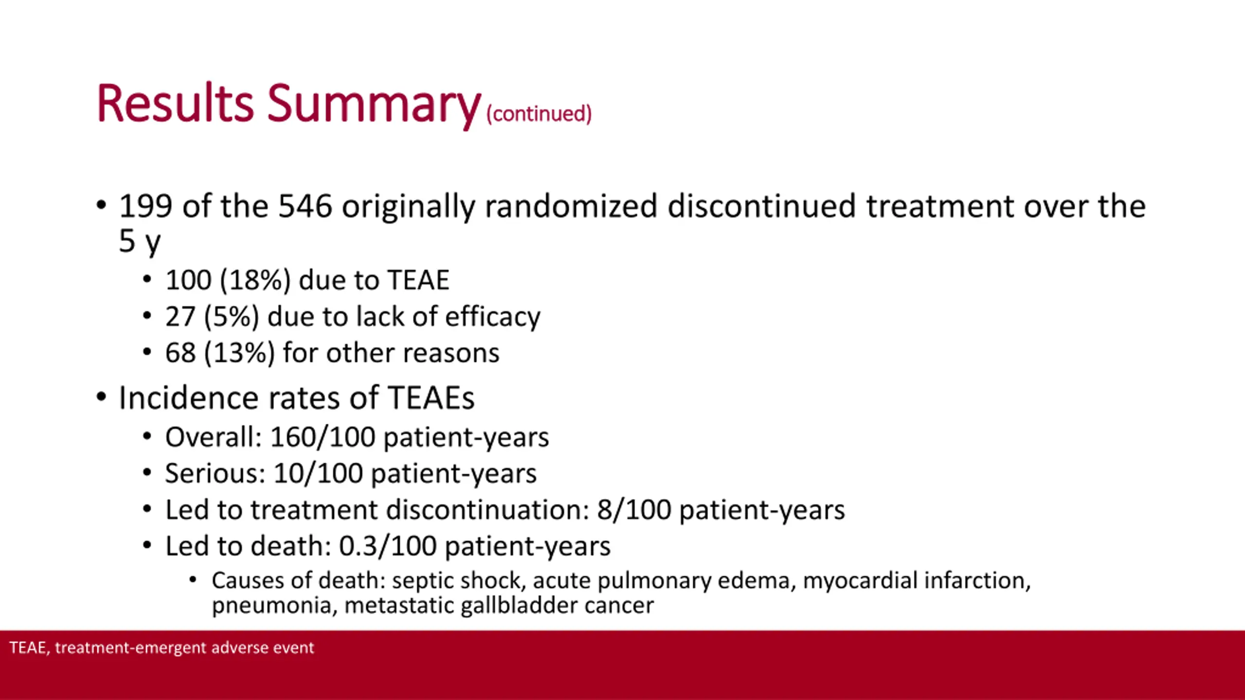 Results Summary Results Summary (continued) (continued) 199 of the 546 originally randomized discontinued treatment over the 5 y 100 (18%) due to TEAE 27 (5%) due to lack of efficacy 68 (13%) for other reasons Incidence rates of TEAEs Overall: 160/100 patient-years Serious: 10/100 patient-years Led to treatment discontinuation: 8/100 patient-years Led to death: 0.3/100 patient-years Causes of death: septic shock, acute pulmonary edema, myocardial infarction, pneumonia, metastatic gallbladder cancer TEAE, treatment-emergent adverse event