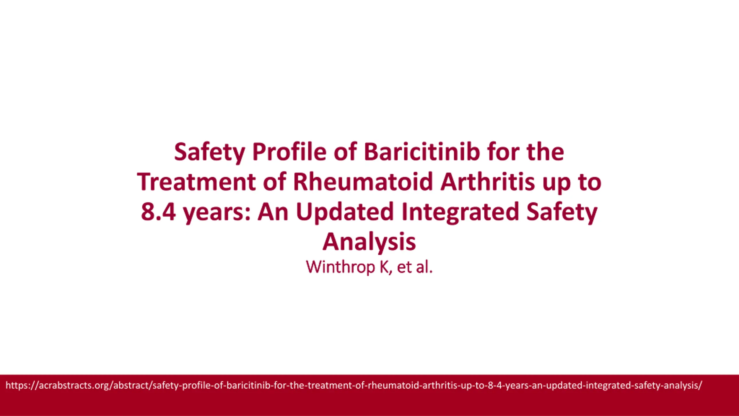 Safety Profile of Baricitinib for the Treatment of Rheumatoid Arthritis up to 8.4 years: An Updated Integrated Safety Analysis Winthrop K, et al. Winthrop K, et al. https://acrabstracts.org/abstract/safety-profile-of-baricitinib-for-the-treatment-of-rheumatoid-arthritis-up-to-8-4-years-an-updated-integrated-safety-analysis/