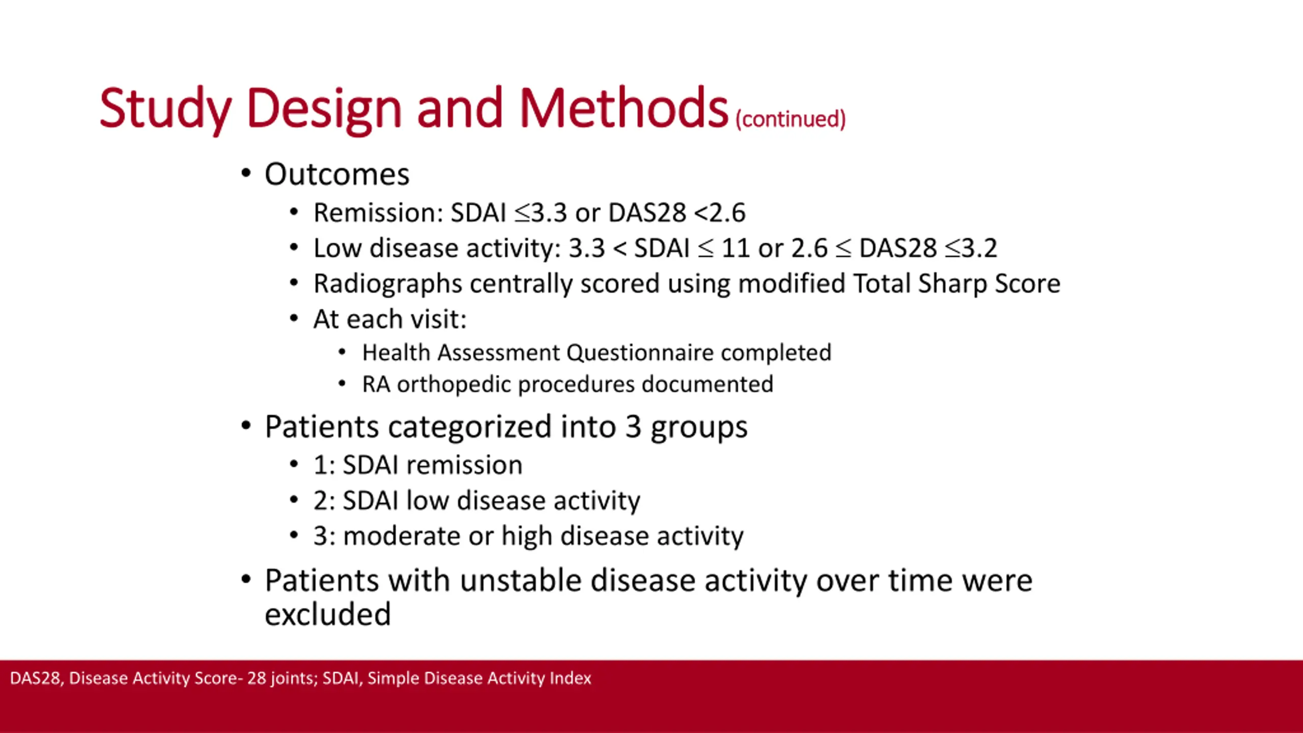 Study Design and Methods Study Design and Methods (continued) Outcomes Remission: SDAI 3.3 or DAS28 <2.6 Low disease activity: 3.3 < SDAI 11 or 2.6 DAS28 3.2 Radiographs centrally scored using modified Total Sharp Score At each visit: Health Assessment Questionnaire completed RA orthopedic procedures documented Patients categorized into 3 groups 1: SDAI remission 2: SDAI low disease activity 3: moderate or high disease activity Patients with unstable disease activity over time were excluded (continued) DAS28, Disease Activity Score- 28 joints; SDAI, Simple Disease Activity Index