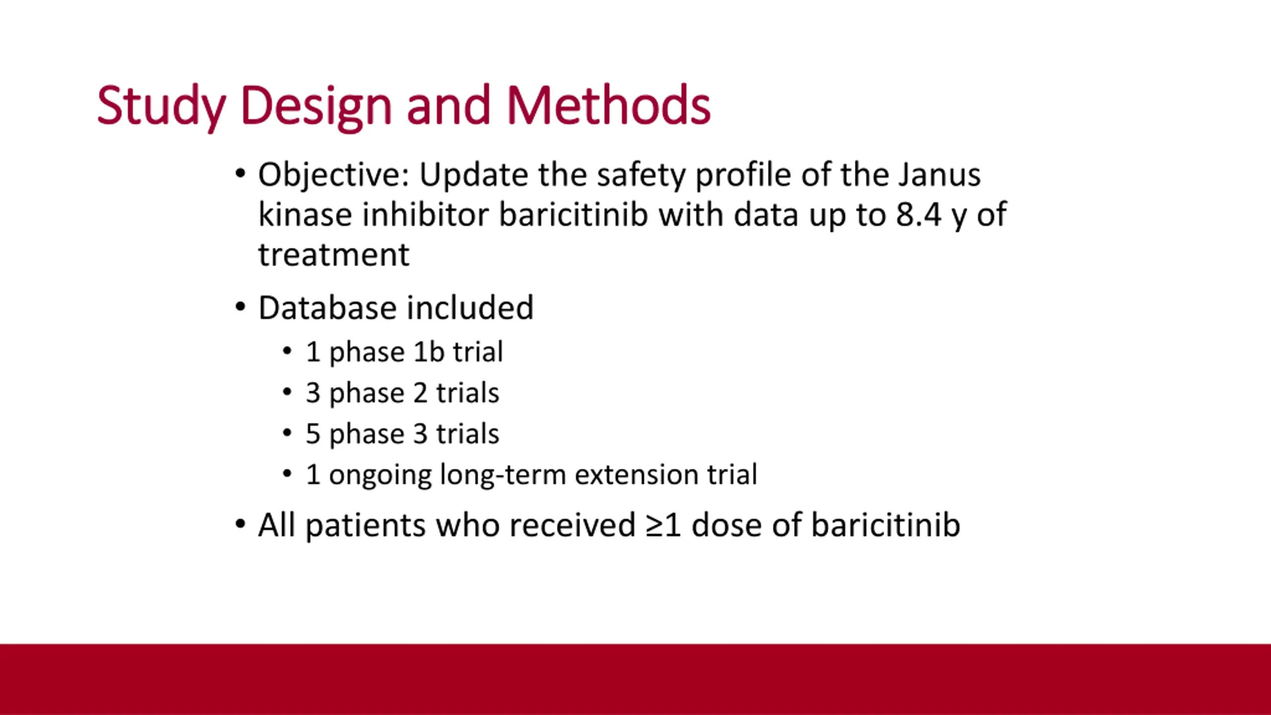 Study Design and Methods Study Design and Methods Objective: Update the safety profile of the Janus kinase inhibitor baricitinib with data up to 8.4 y of treatment Database included 1 phase 1b trial 3 phase 2 trials 5 phase 3 trials 1 ongoing long-term extension trial All patients who received 1 dose of baricitinib