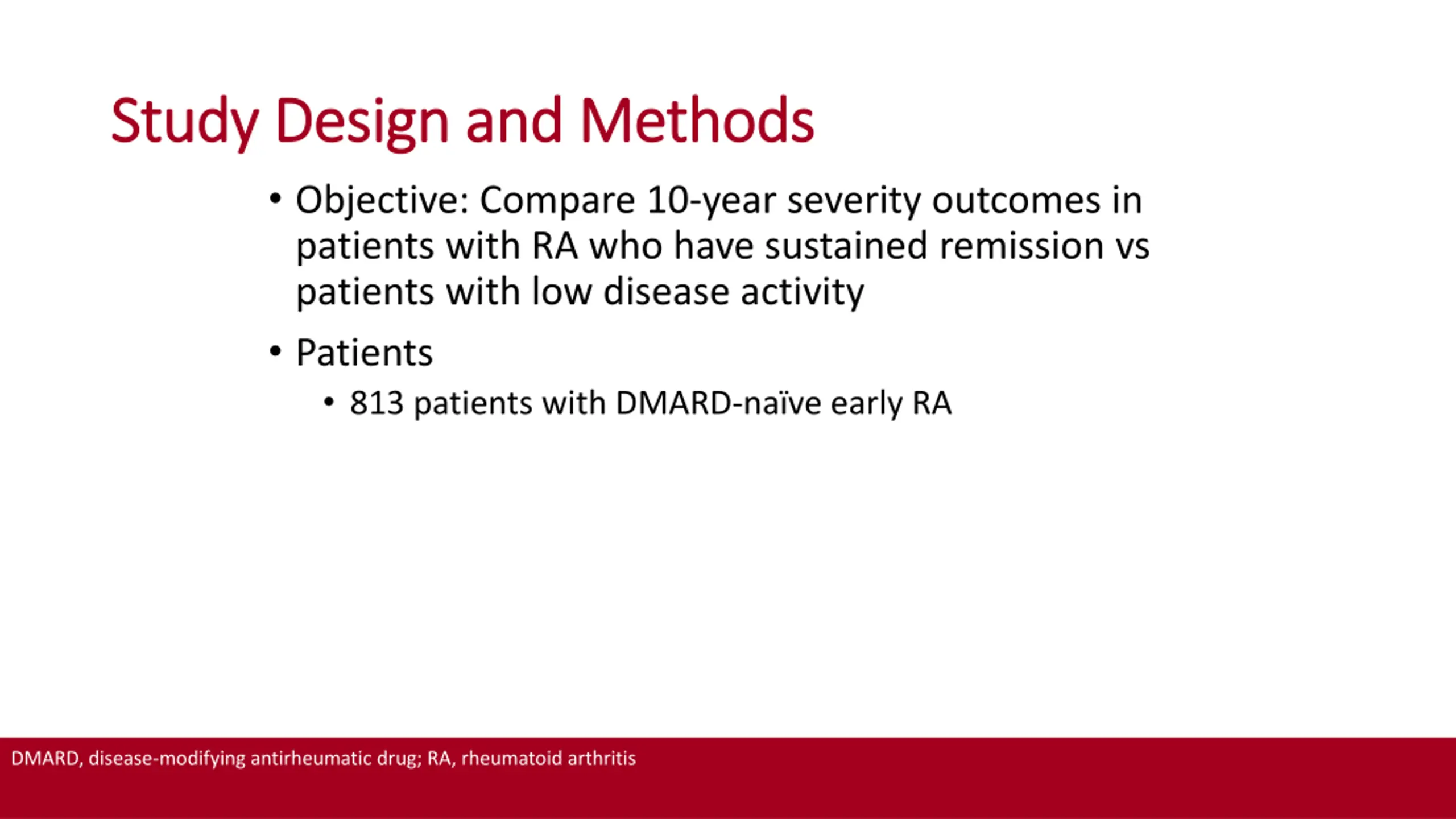 Study Design and Methods Study Design and Methods Objective: Compare 10-year severity outcomes in patients with RA who have sustained remission vs patients with low disease activity Patients 813 patients with DMARD-na ve early RA DMARD, disease-modifying antirheumatic drug; RA, rheumatoid arthritis