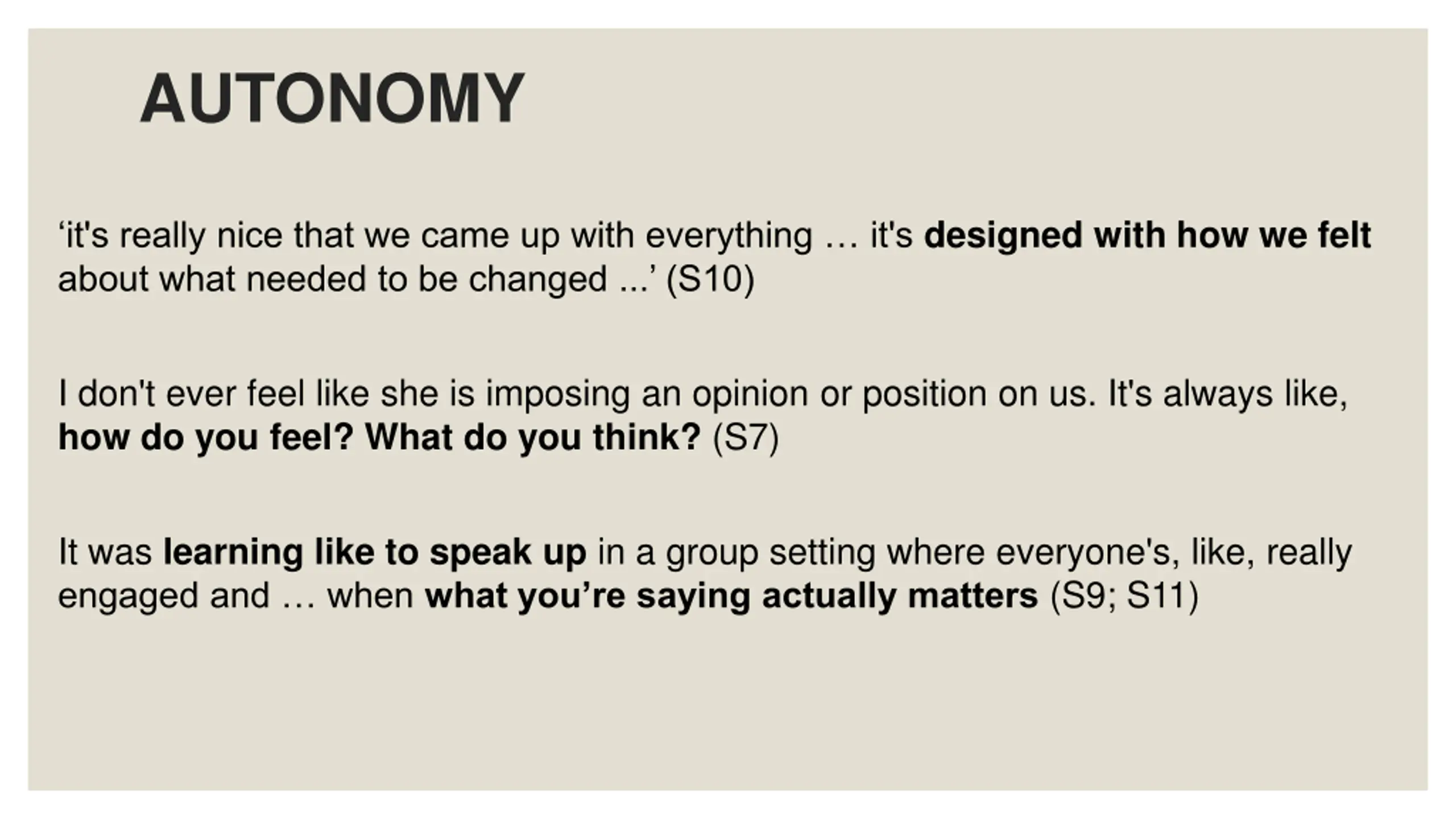 AUTONOMY it's really nice that we came up with everything it's designed with how we felt about what needed to be changed ... (S10) I don't ever feel like she is imposing an opinion or position on us. It's always like, how do you feel? What do you think? (S7) It was learning like to speak up in a group setting where everyone's, like, really engaged and when what you re saying actually matters (S9; S11)