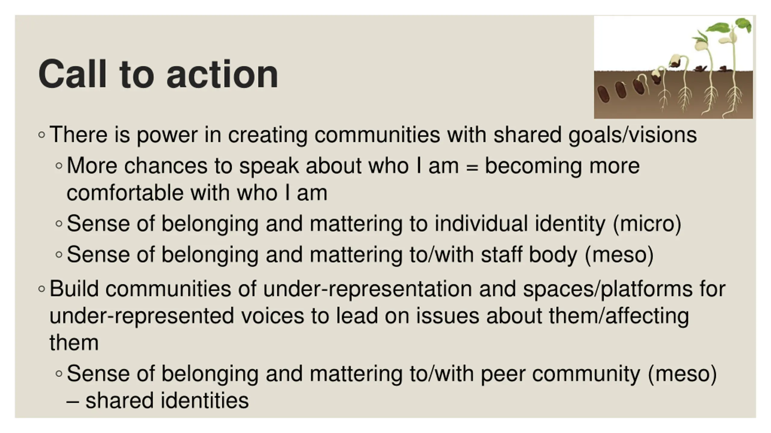Call to action There is power in creating communities with shared goals/visions More chances to speak about who I am = becoming more comfortable with who I am Sense of belonging and mattering to individual identity (micro) Sense of belonging and mattering to/with staff body (meso) Build communities of under-representation and spaces/platforms for under-represented voices to lead on issues about them/affecting them Sense of belonging and mattering to/with peer community (meso) shared identities