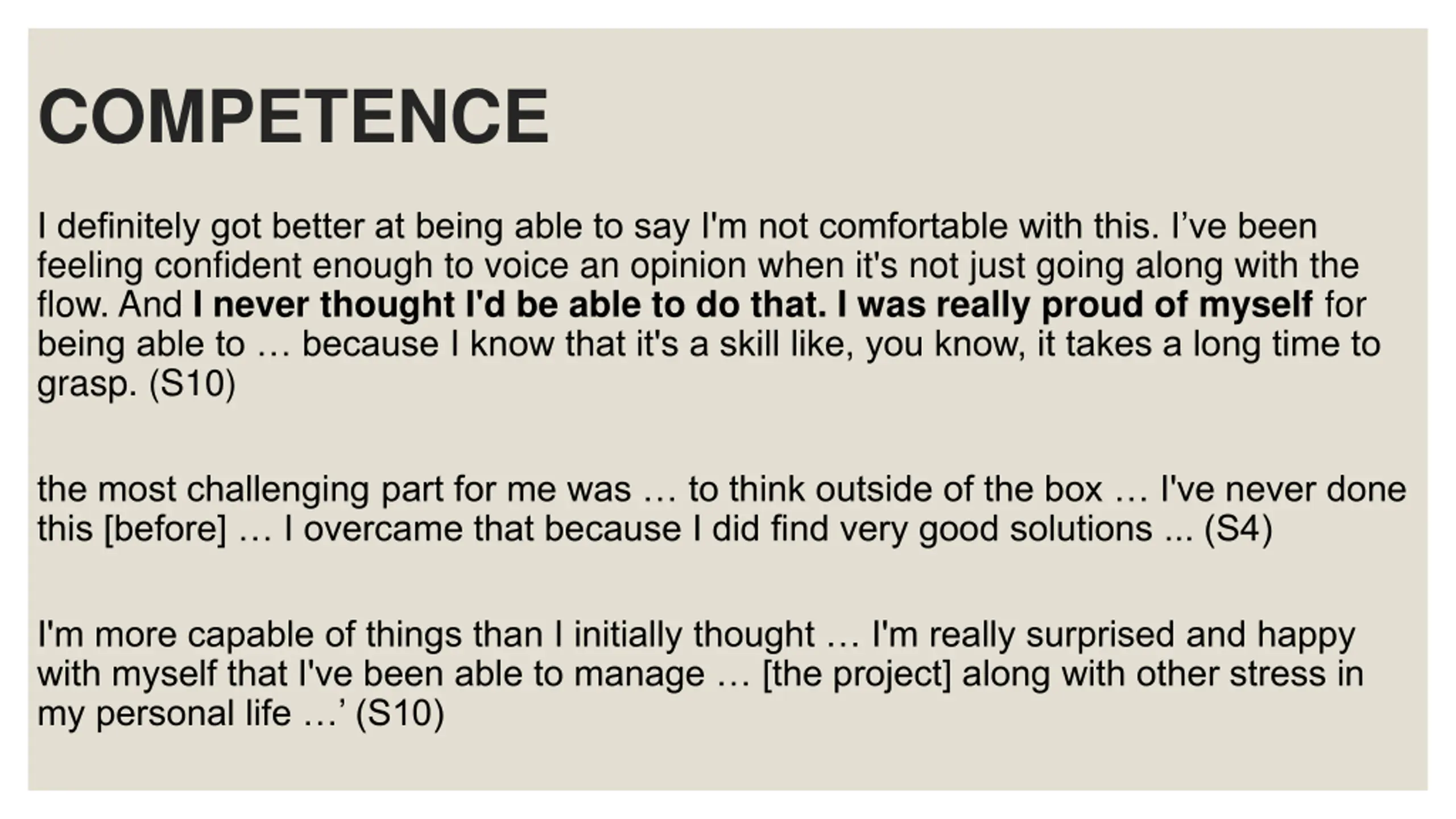 COMPETENCE I definitely got better at being able to say I'm not comfortable with this. I ve been feeling confident enough to voice an opinion when it's not just going along with the flow. And I never thought I'd be able to do that. I was really proud of myself for being able to because I know that it's a skill like, you know, it takes a long time to grasp. (S10) the most challenging part for me was to think outside of the box I've never done this [before] I overcame that because I did find very good solutions ... (S4) I'm more capable of things than I initially thought I'm really surprised and happy with myself that I've been able to manage [the project] along with other stress in my personal life (S10)