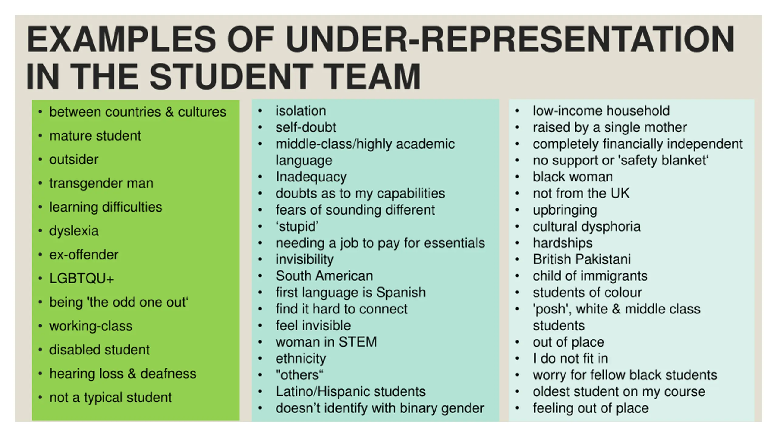 EXAMPLES OF UNDER-REPRESENTATION IN THE STUDENT TEAM between countries & cultures isolation self-doubt middle-class/highly academic language Inadequacy doubts as to my capabilities fears of sounding different stupid needing a job to pay for essentials invisibility South American first language is Spanish find it hard to connect feel invisible woman in STEM ethnicity "others Latino/Hispanic students doesn t identify with binary gender low-income household raised by a single mother completely financially independent no support or 'safety blanket black woman not from the UK upbringing cultural dysphoria hardships British Pakistani child of immigrants students of colour 'posh', white & middle class students out of place I do not fit in worry for fellow black students oldest student on my course feeling out of place mature student outsider transgender man learning difficulties dyslexia ex-offender LGBTQU+ being 'the odd one out working-class disabled student hearing loss & deafness not a typical student