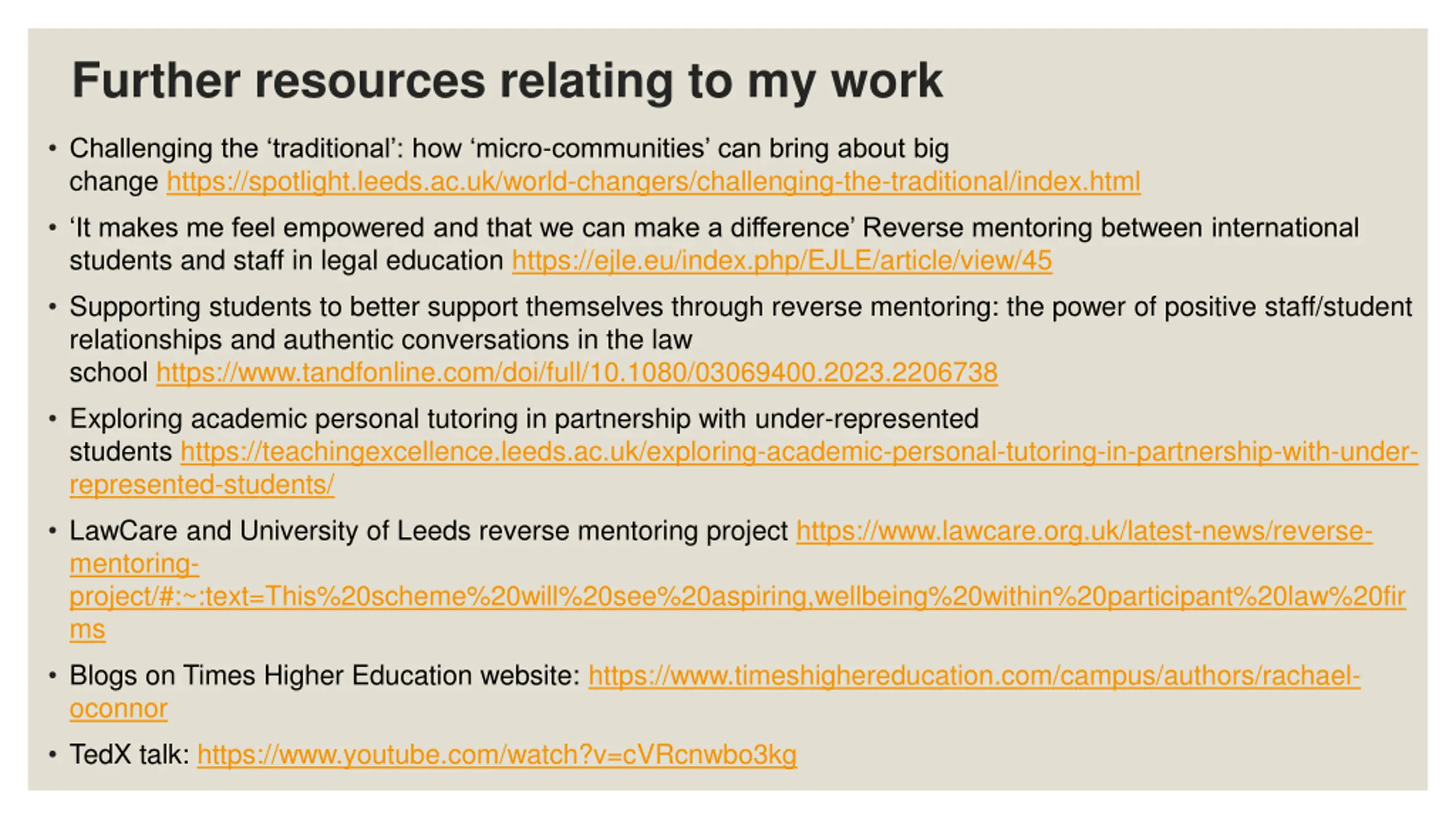 Further resources relating to my work Challenging the traditional : how micro-communities can bring about big change https://spotlight.leeds.ac.uk/world-changers/challenging-the-traditional/index.html It makes me feel empowered and that we can make a difference Reverse mentoring between international students and staff in legal education https://ejle.eu/index.php/EJLE/article/view/45 Supporting students to better support themselves through reverse mentoring: the power of positive staff/student relationships and authentic conversations in the law school https://www.tandfonline.com/doi/full/10.1080/03069400.2023.2206738 Exploring academic personal tutoring in partnership with under-represented students https://teachingexcellence.leeds.ac.uk/exploring-academic-personal-tutoring-in-partnership-with-under- represented-students/ LawCare and University of Leeds reverse mentoring project https://www.lawcare.org.uk/latest-news/reverse- mentoring- project/#:~:text=This%20scheme%20will%20see%20aspiring,wellbeing%20within%20participant%20law%20fir ms Blogs on Times Higher Education website: https://www.timeshighereducation.com/campus/authors/rachael- oconnor TedX talk: https://www.youtube.com/watch?v=cVRcnwbo3kg