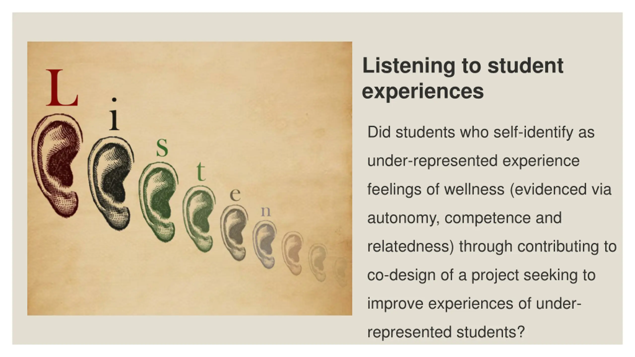 Listening to student experiences Did students who self-identify as under-represented experience feelings of wellness (evidenced via autonomy, competence and relatedness) through contributing to co-design of a project seeking to improve experiences of under- represented students?
