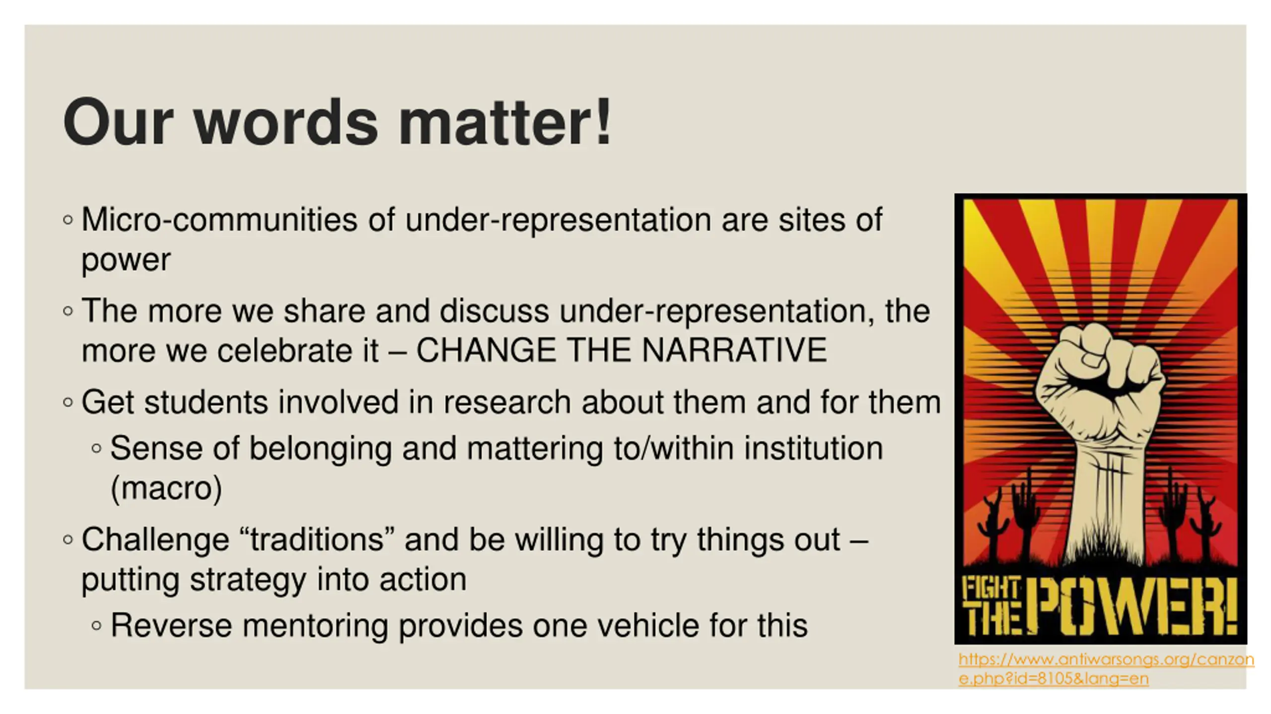Our words matter! Micro-communities of under-representation are sites of power The more we share and discuss under-representation, the more we celebrate it CHANGE THE NARRATIVE Get students involved in research about them and for them Sense of belonging and mattering to/within institution (macro) Challenge traditions and be willing to try things out putting strategy into action Reverse mentoring provides one vehicle for this https://www.antiwarsongs.org/canzon e.php?id=8105&lang=en