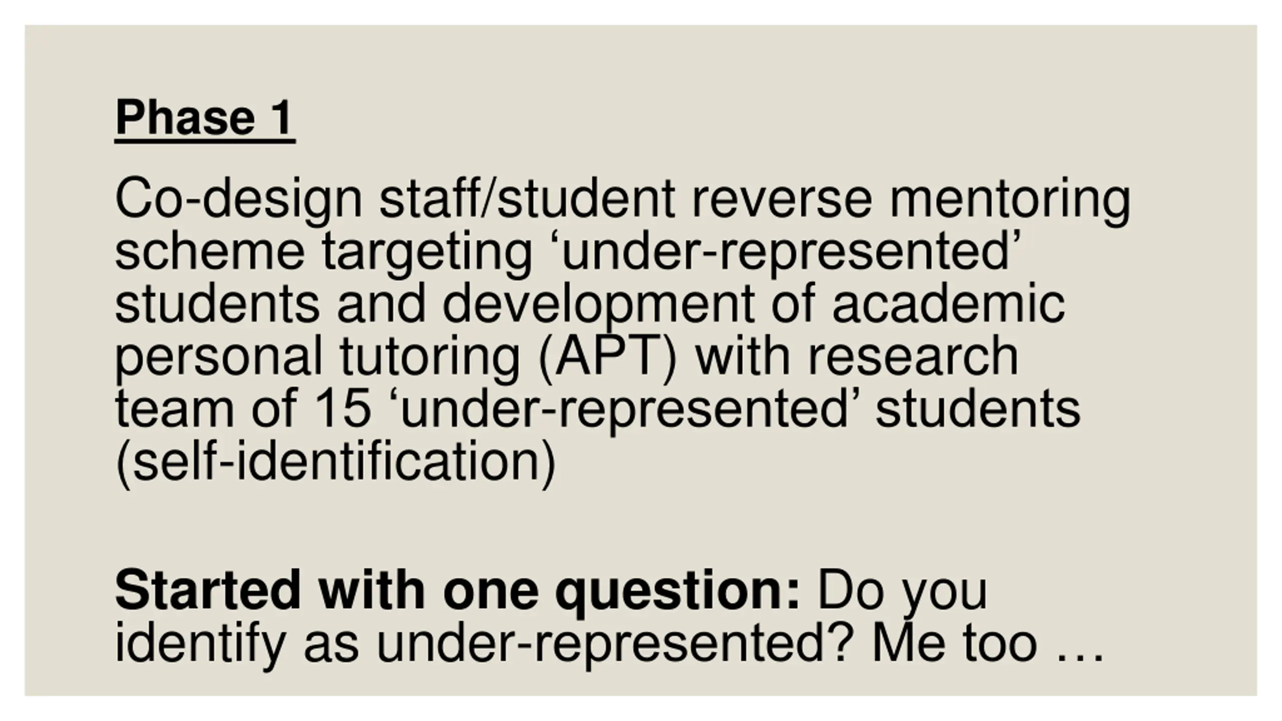 Phase 1 Co-design staff/student reverse mentoring scheme targeting under-represented students and development of academic personal tutoring (APT) with research team of 15 under-represented students (self-identification) Started with one question: Do you identify as under-represented? Me too