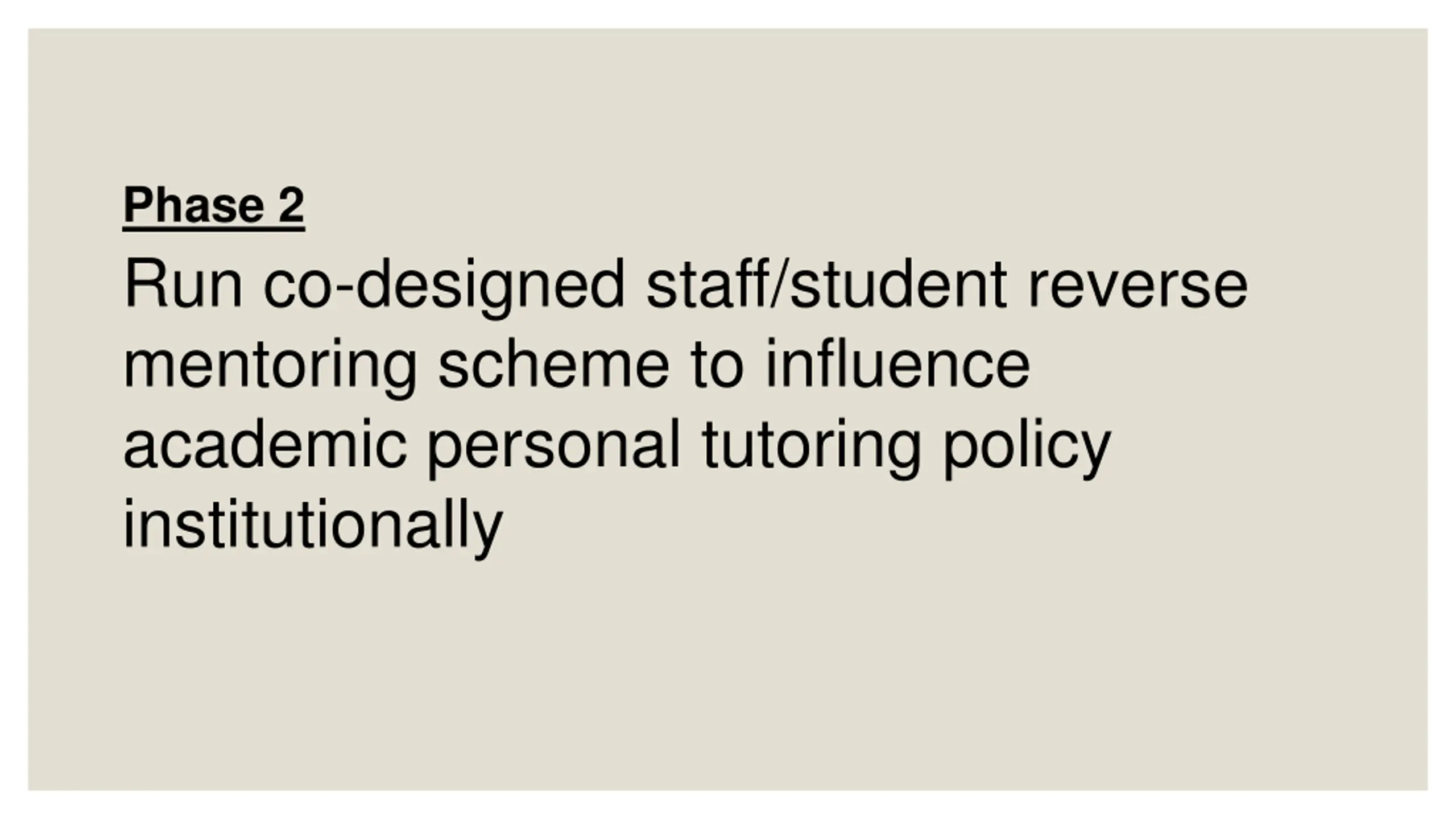 Phase 2 Run co-designed staff/student reverse mentoring scheme to influence academic personal tutoring policy institutionally
