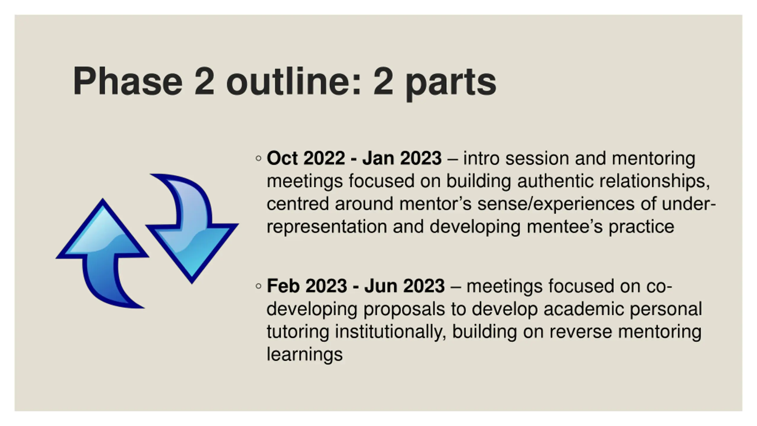 Phase 2 outline: 2 parts Oct 2022 - Jan 2023 intro session and mentoring meetings focused on building authentic relationships, centred around mentor s sense/experiences of under- representation and developing mentee s practice Feb 2023 - Jun 2023 meetings focused on co- developing proposals to develop academic personal tutoring institutionally, building on reverse mentoring learnings