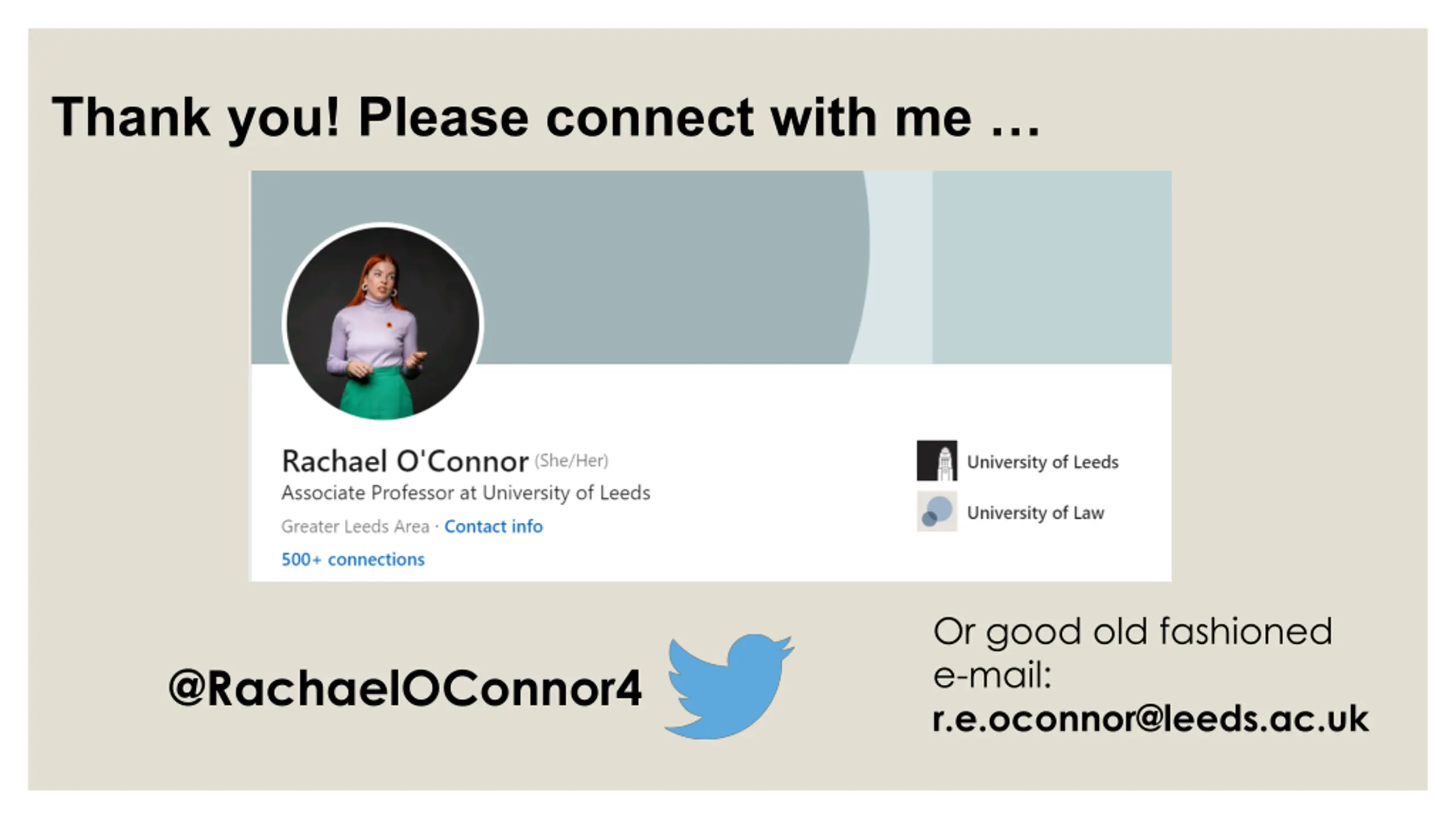 Thank you! Please connect with me Or good old fashioned e-mail: r.e.oconnor@leeds.ac.uk @RachaelOConnor4