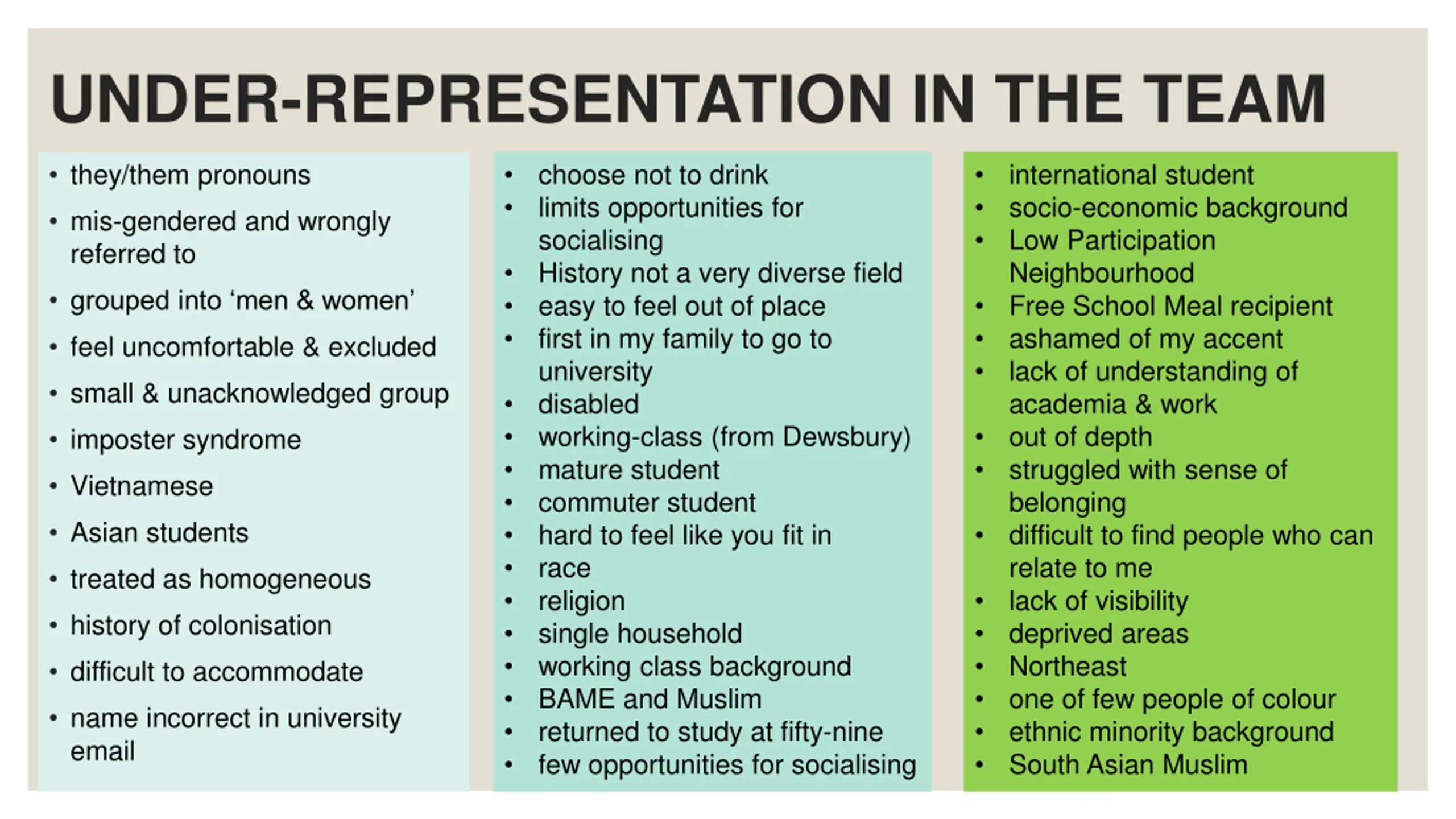 UNDER-REPRESENTATION IN THE TEAM they/them pronouns choose not to drink limits opportunities for socialising History not a very diverse field easy to feel out of place first in my family to go to university disabled working-class (from Dewsbury) mature student commuter student hard to feel like you fit in race religion single household working class background BAME and Muslim returned to study at fifty-nine few opportunities for socialising international student socio-economic background Low Participation Neighbourhood Free School Meal recipient ashamed of my accent lack of understanding of academia & work out of depth struggled with sense of belonging difficult to find people who can relate to me lack of visibility deprived areas Northeast one of few people of colour ethnic minority background South Asian Muslim mis-gendered and wrongly referred to grouped into men & women feel uncomfortable & excluded small & unacknowledged group imposter syndrome Vietnamese Asian students treated as homogeneous history of colonisation difficult to accommodate name incorrect in university email
