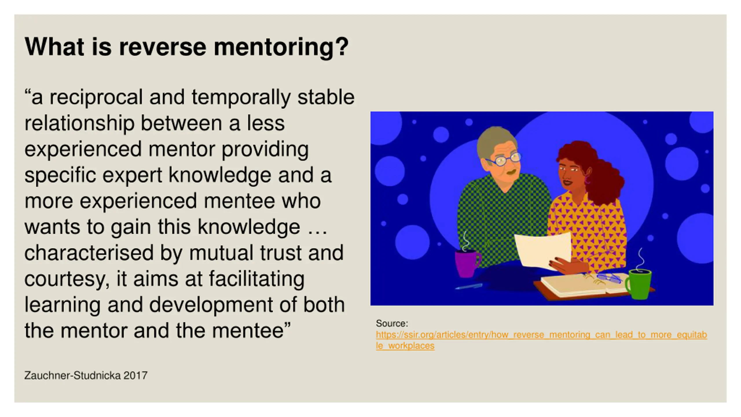 What is reverse mentoring? a reciprocal and temporally stable relationship between a less experienced mentor providing specific expert knowledge and a more experienced mentee who wants to gain this knowledge characterised by mutual trust and courtesy, it aims at facilitating learning and development of both the mentor and the mentee Source: https://ssir.org/articles/entry/how_reverse_mentoring_can_lead_to_more_equitab le_workplaces Zauchner-Studnicka 2017