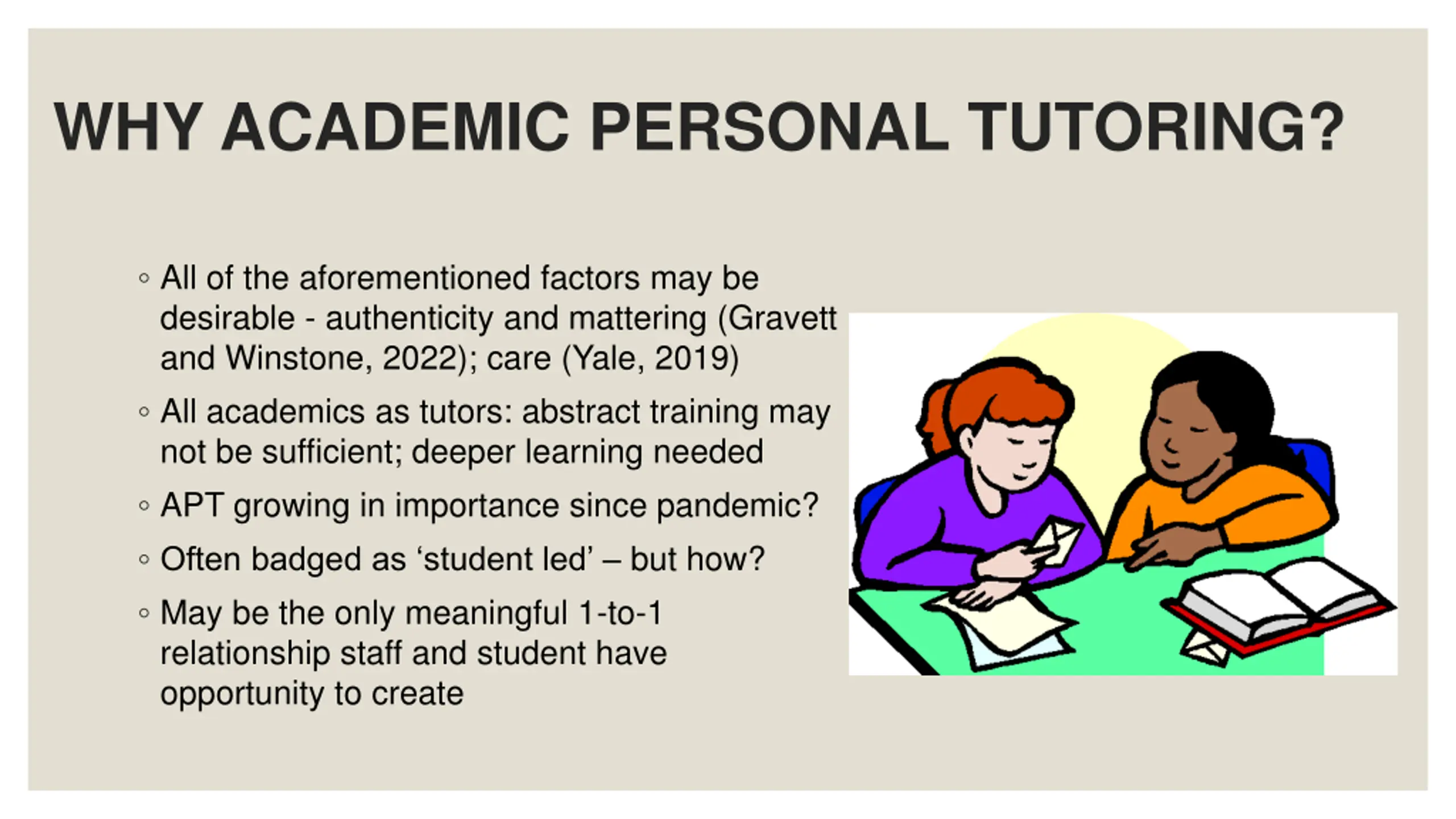 WHY ACADEMIC PERSONAL TUTORING? All of the aforementioned factors may be desirable - authenticity and mattering (Gravett and Winstone, 2022); care (Yale, 2019) All academics as tutors: abstract training may not be sufficient; deeper learning needed APT growing in importance since pandemic? Often badged as student led but how? May be the only meaningful 1-to-1 relationship staff and student have opportunity to create