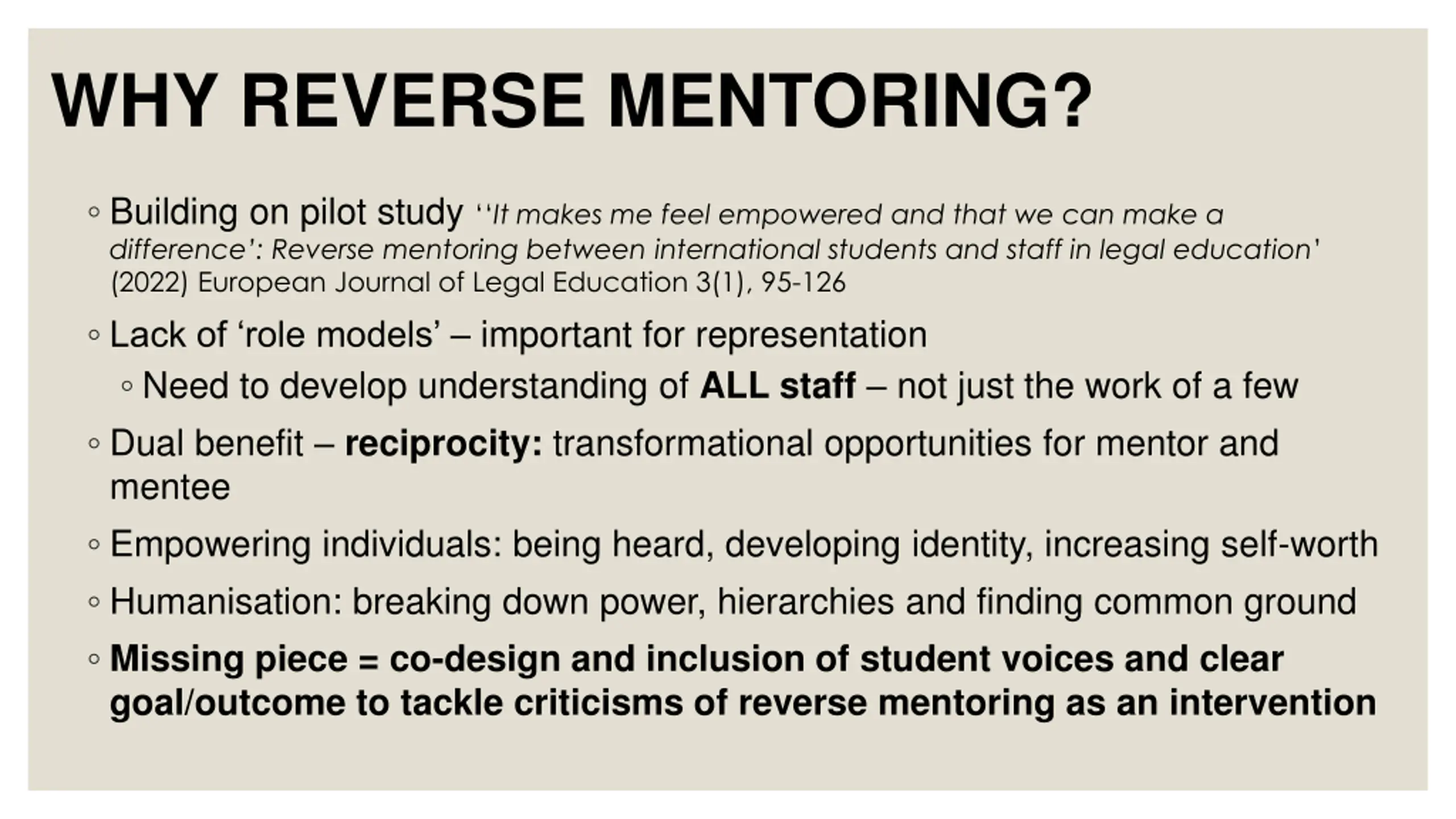 WHY REVERSE MENTORING? Building on pilot study It makes me feel empowered and that we can make a difference : Reverse mentoring between international students and staff in legal education (2022) European Journal of Legal Education 3(1), 95-126 Lack of role models important for representation Need to develop understanding of ALL staff not just the work of a few Dual benefit reciprocity: transformational opportunities for mentor and mentee Empowering individuals: being heard, developing identity, increasing self-worth Humanisation: breaking down power, hierarchies and finding common ground Missing piece = co-design and inclusion of student voices and clear goal/outcome to tackle criticisms of reverse mentoring as an intervention