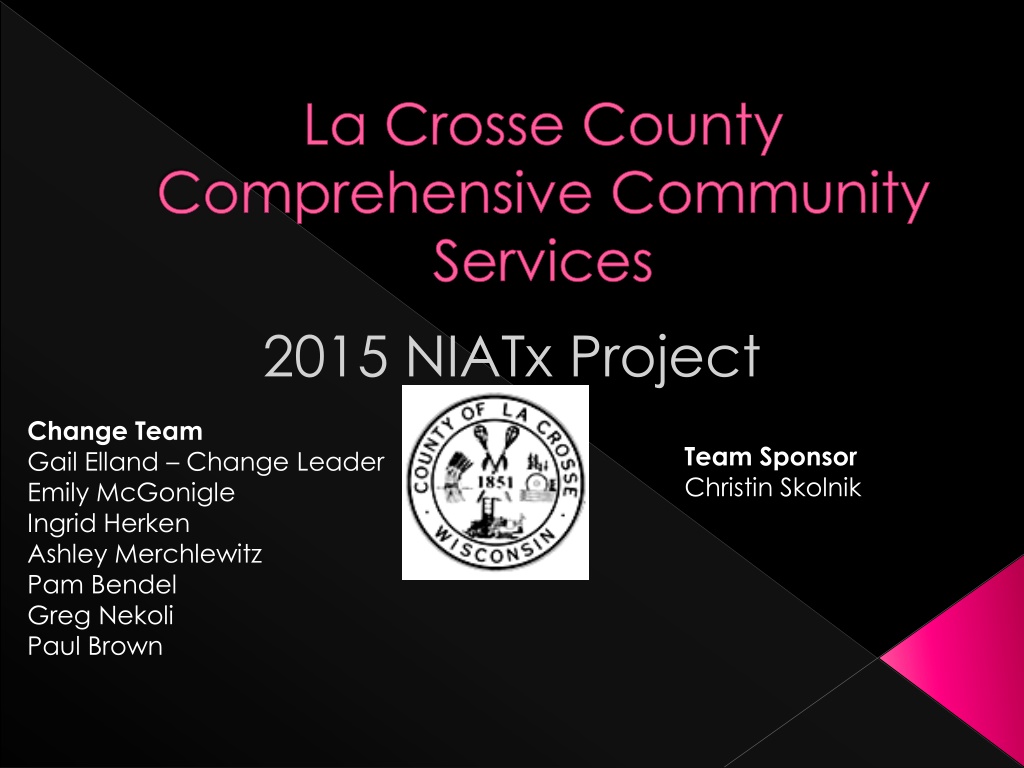 La Crosse County Comprehensive Community Services 2015 NIATx Project Change Team Gail Elland Change Leader Emily McGonigle Ingrid Herken Ashley Merchlewitz Pam Bendel Greg Nekoli Paul Brown Team Sponsor Christin Skolnik
