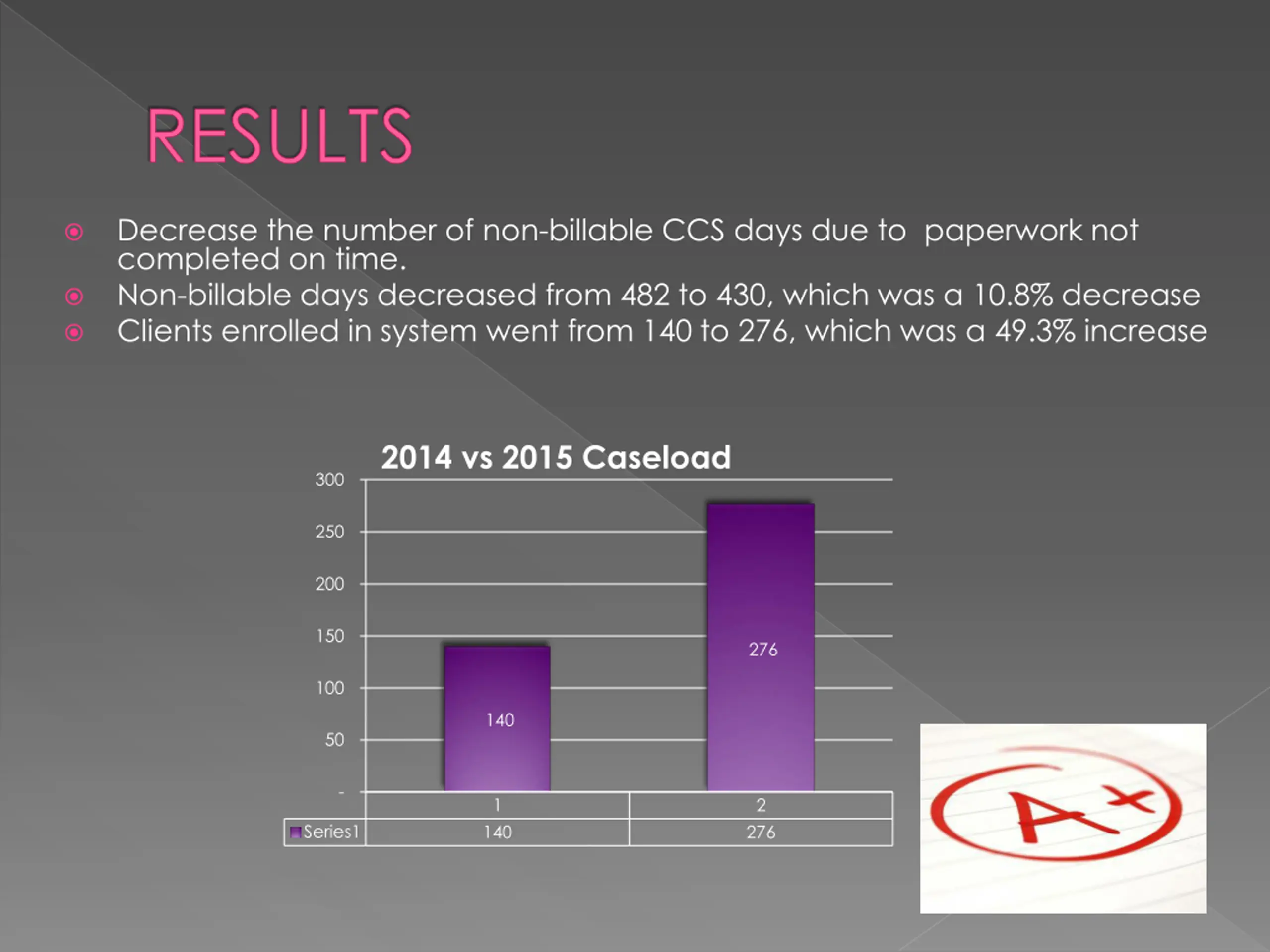RESULTS Decrease the number of non-billable CCS days due to paperwork not completed on time. Non-billable days decreased from 482 to 430, which was a 10.8% decrease Clients enrolled in system went from 140 to 276, which was a 49.3% increase 2014 vs 2015 Caseload 300 250 200 150 276 100 140 50 - 1 2 Series1 140 276