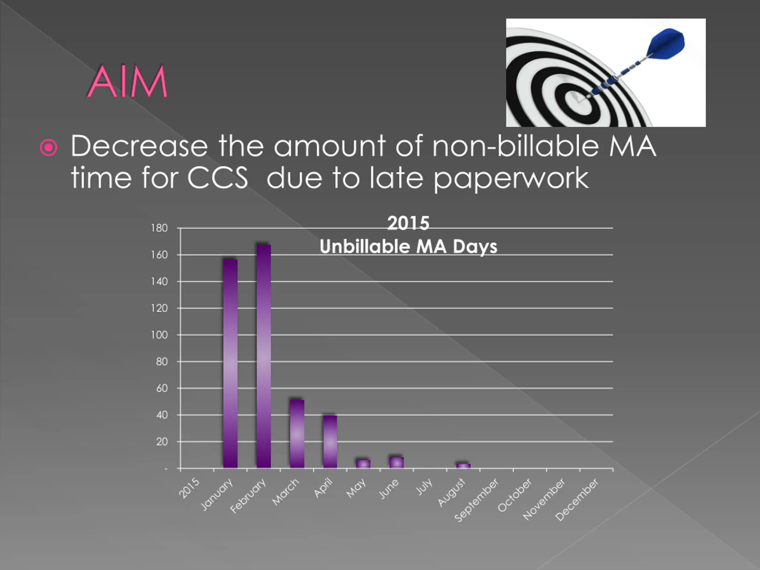 AIM Decrease the amount of non-billable MA time for CCS due to late paperwork 2015 180 Unbillable MA Days 160 140 120 100 80 60 40 20 -