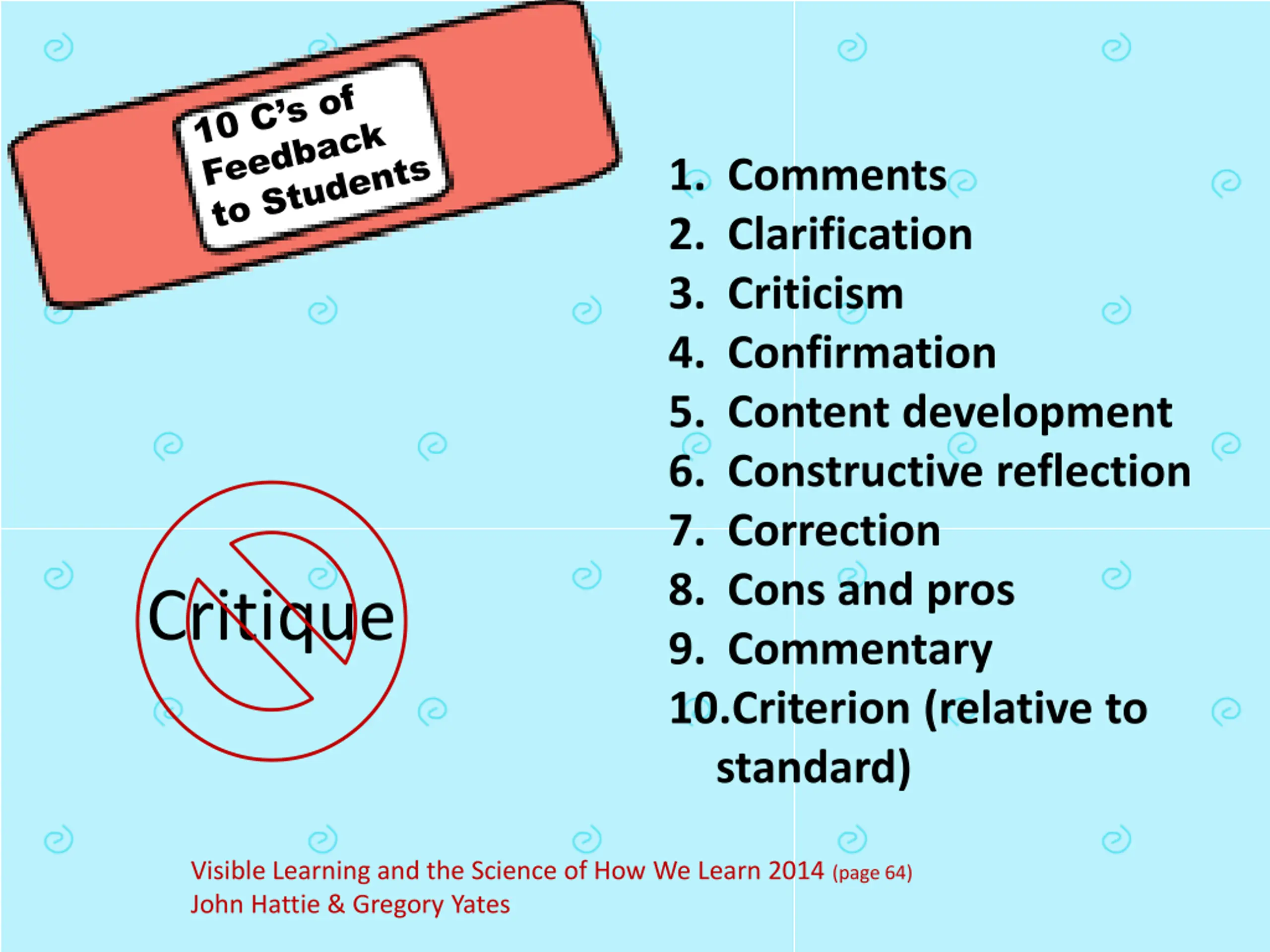 1. Comments 2. Clarification 3. Criticism 4. Confirmation 5. Content development 6. Constructive reflection 7. Correction 8. Cons and pros 9. Commentary 10.Criterion (relative to standard) Critique Visible Learning and the Science of How We Learn 2014 (page 64) John Hattie & Gregory Yates
