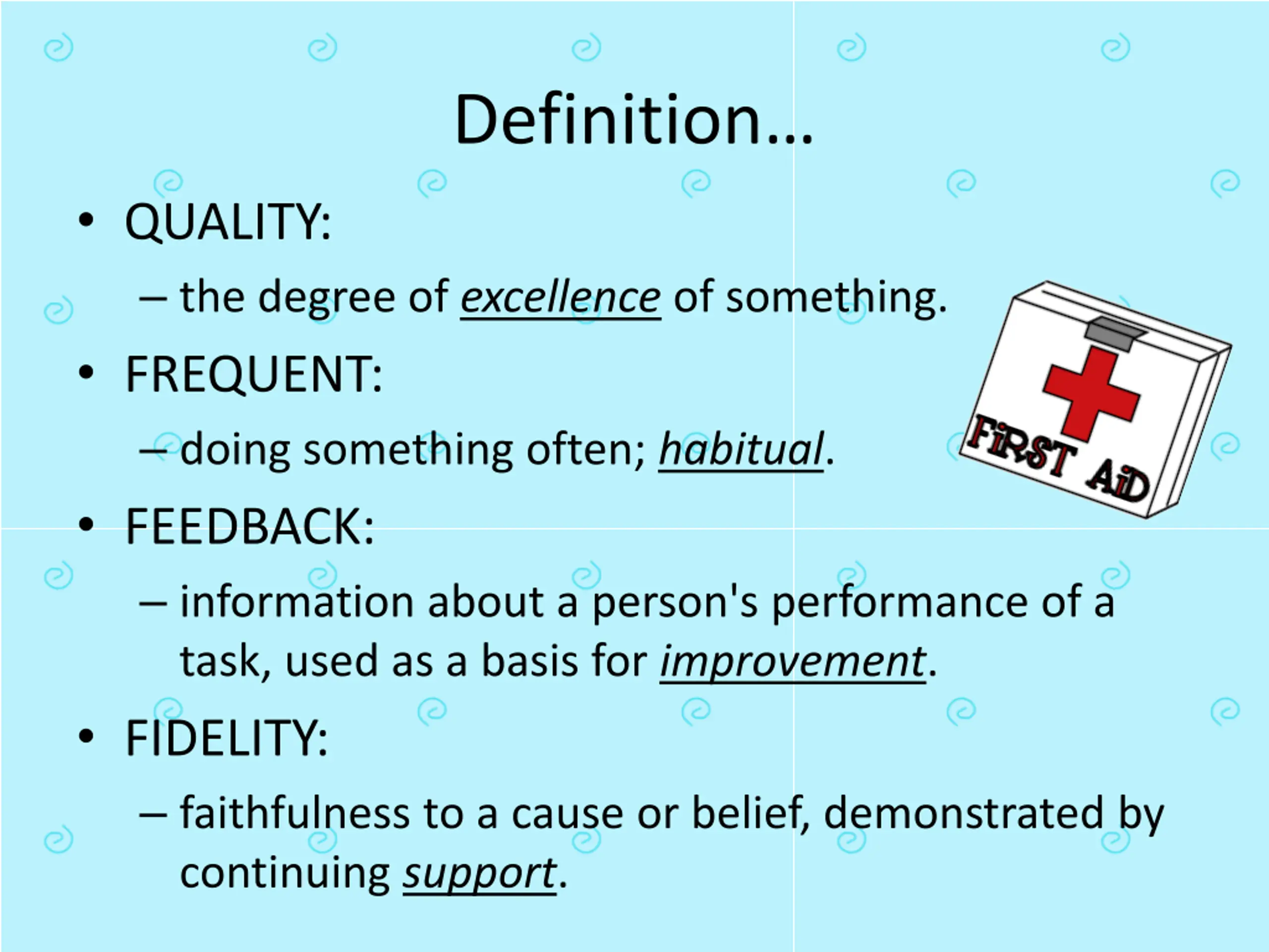 Definition QUALITY: the degree of excellence of something. FREQUENT: doing something often; habitual. FEEDBACK: information about a person's performance of a task, used as a basis for improvement. FIDELITY: faithfulness to a cause or belief, demonstrated by continuing support.