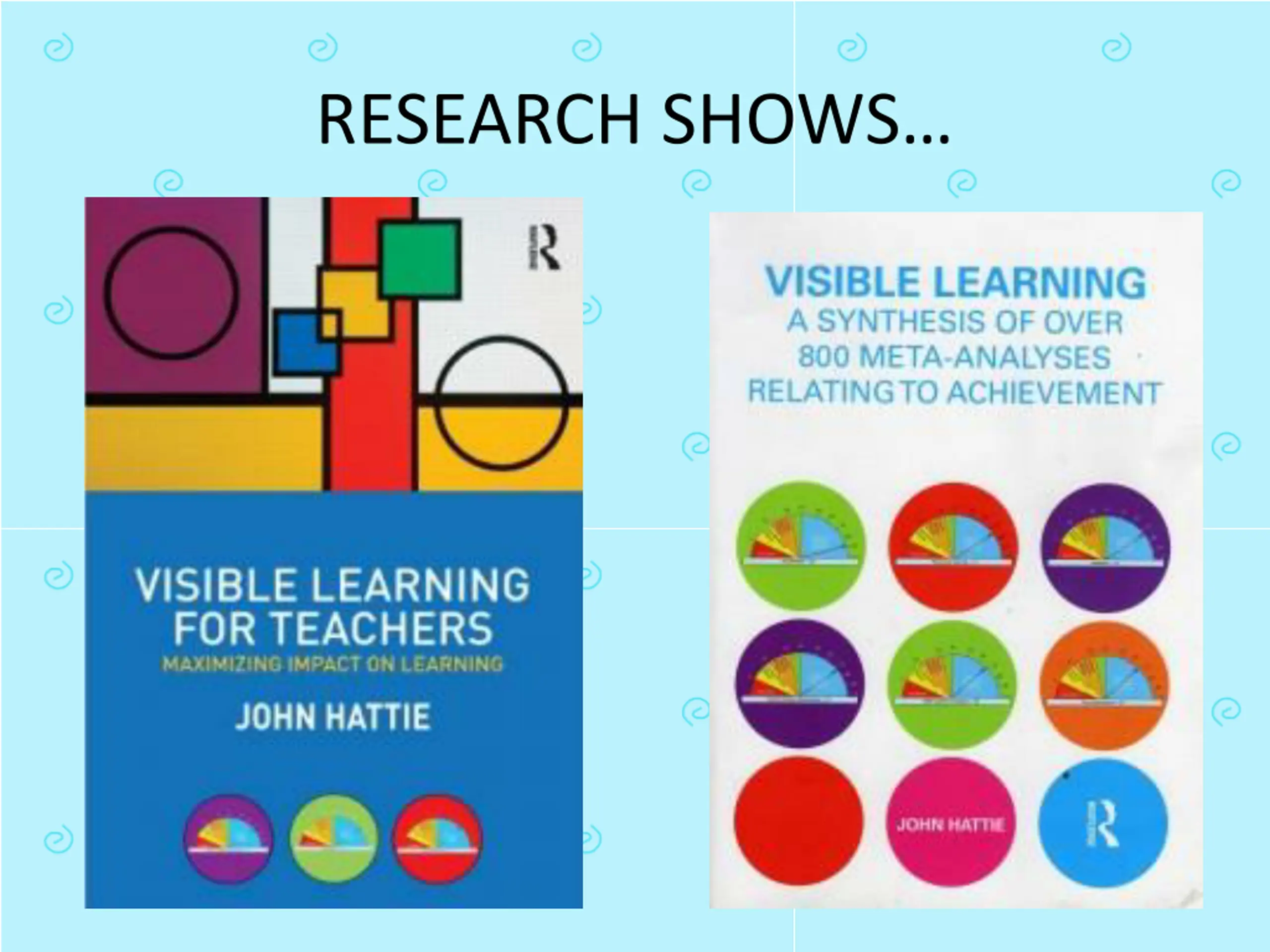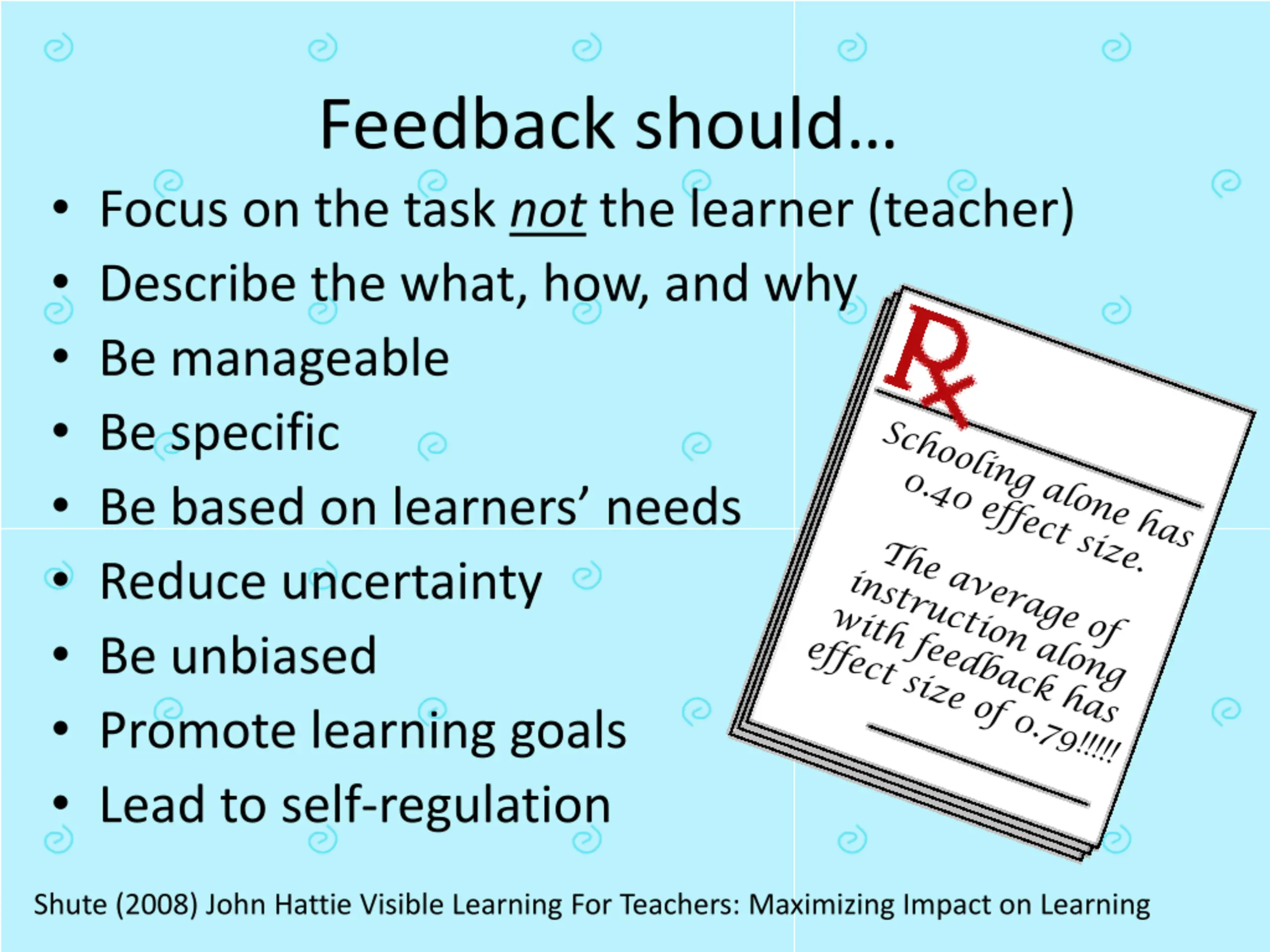 Feedback should Focus on the task not the learner (teacher) Describe the what, how, and why Be manageable Be specific Be based on learners needs Reduce uncertainty Be unbiased Promote learning goals Lead to self-regulation Shute (2008) John Hattie Visible Learning For Teachers: Maximizing Impact on Learning
