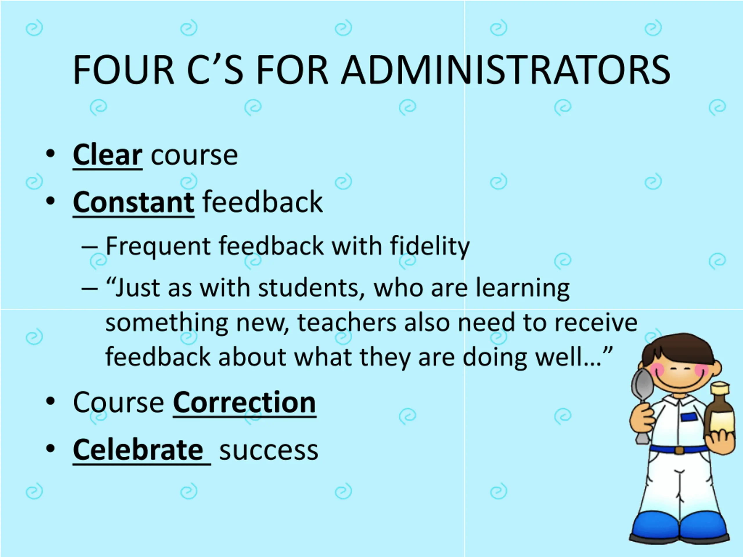 FOUR CS FOR ADMINISTRATORS Clear course Constant feedback Frequent feedback with fidelity Just as with students, who are learning something new, teachers also need to receive feedback about what they are doing well Course Correction Celebrate success