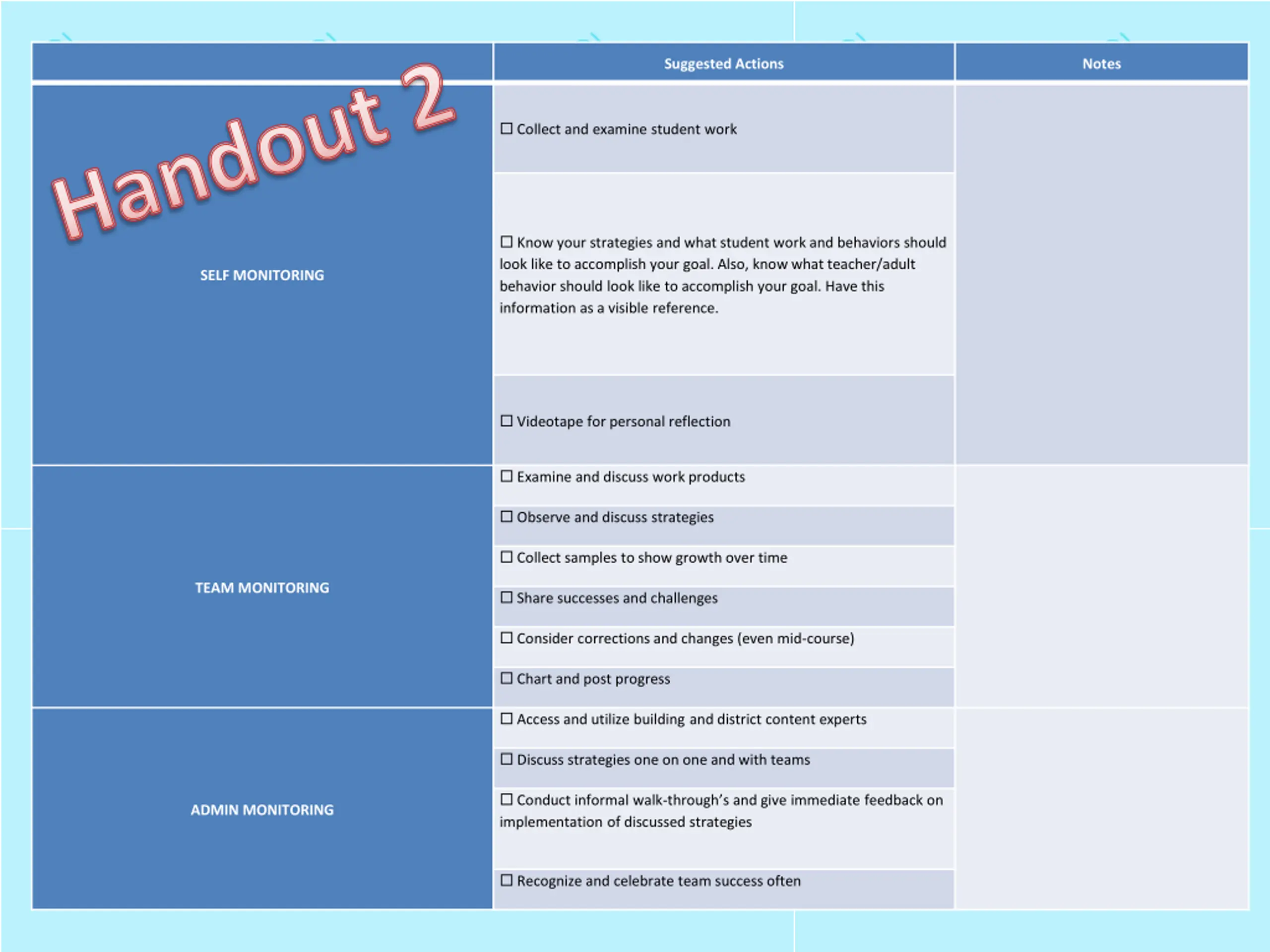 Handout 2 Suggested Actions Notes Collect and examine student work Know your strategies and what student work and behaviors should look like to accomplish your goal. Also, know what teacher/adult behavior should look like to accomplish your goal. Have this information as a visible reference. SELF MONITORING Videotape for personal reflection Examine and discuss work products Observe and discuss strategies Collect samples to show growth over time TEAM MONITORING Share successes and challenges Consider corrections and changes (even mid-course) Chart and post progress Access and utilize building and district content experts Discuss strategies one on one and with teams Conduct informal walk-through s and give immediate feedback on implementation of discussed strategies ADMIN MONITORING Recognize and celebrate team success often