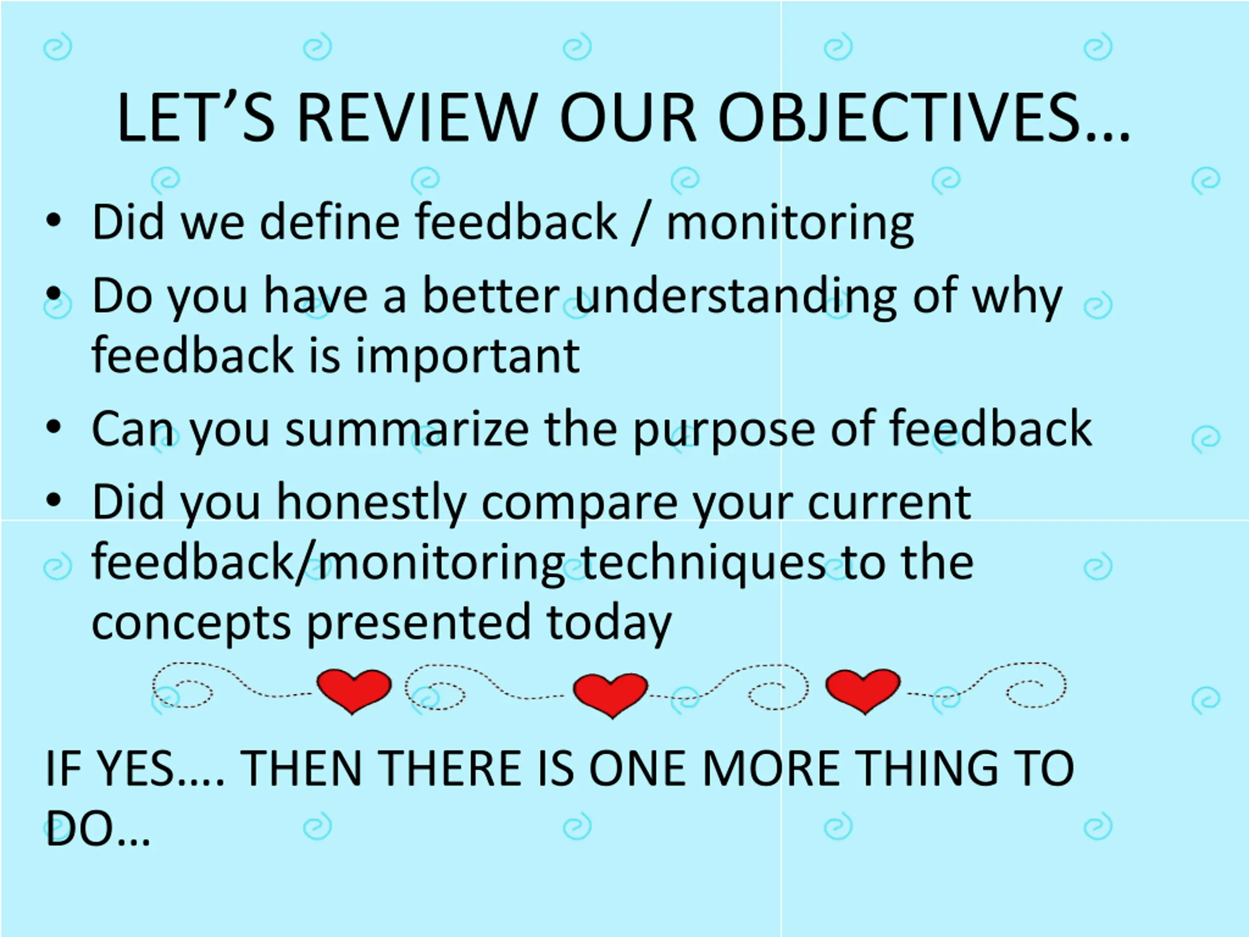 LETS REVIEW OUR OBJECTIVES Did we define feedback / monitoring Do you have a better understanding of why feedback is important Can you summarize the purpose of feedback Did you honestly compare your current feedback/monitoring techniques to the concepts presented today IF YES . THEN THERE IS ONE MORE THING TO DO