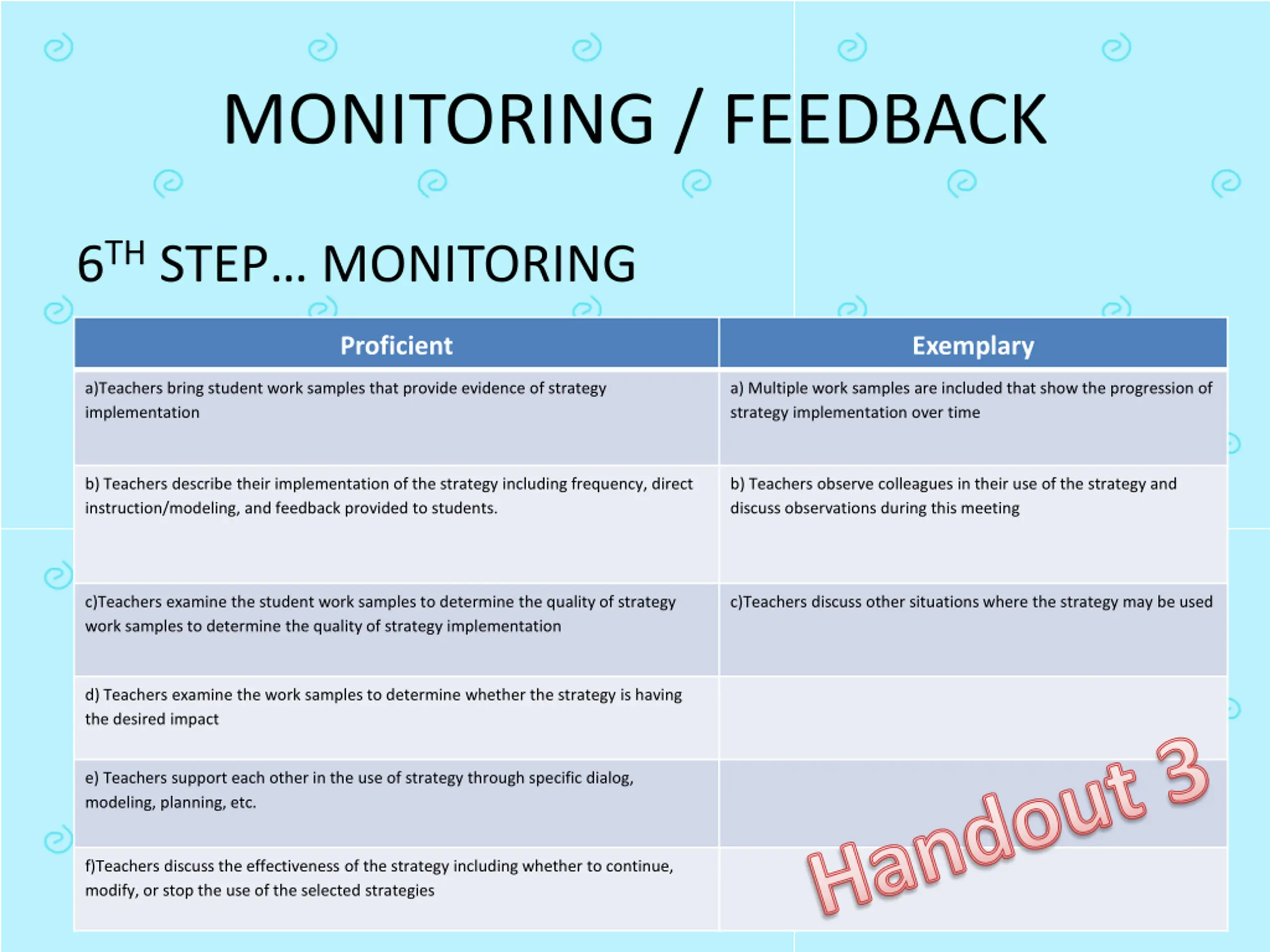 MONITORING / FEEDBACK 6THSTEP MONITORING Proficient Exemplary a)Teachers bring student work samples that provide evidence of strategy implementation a) Multiple work samples are included that show the progression of strategy implementation over time b) Teachers describe their implementation of the strategy including frequency, direct instruction/modeling, and feedback provided to students. b) Teachers observe colleagues in their use of the strategy and discuss observations during this meeting c)Teachers examine the student work samples to determine the quality of strategy work samples to determine the quality of strategy implementation c)Teachers discuss other situations where the strategy may be used d) Teachers examine the work samples to determine whether the strategy is having the desired impact Handout 3 e) Teachers support each other in the use of strategy through specific dialog, modeling, planning, etc. f)Teachers discuss the effectiveness of the strategy including whether to continue, modify, or stop the use of the selected strategies